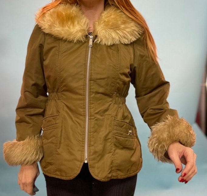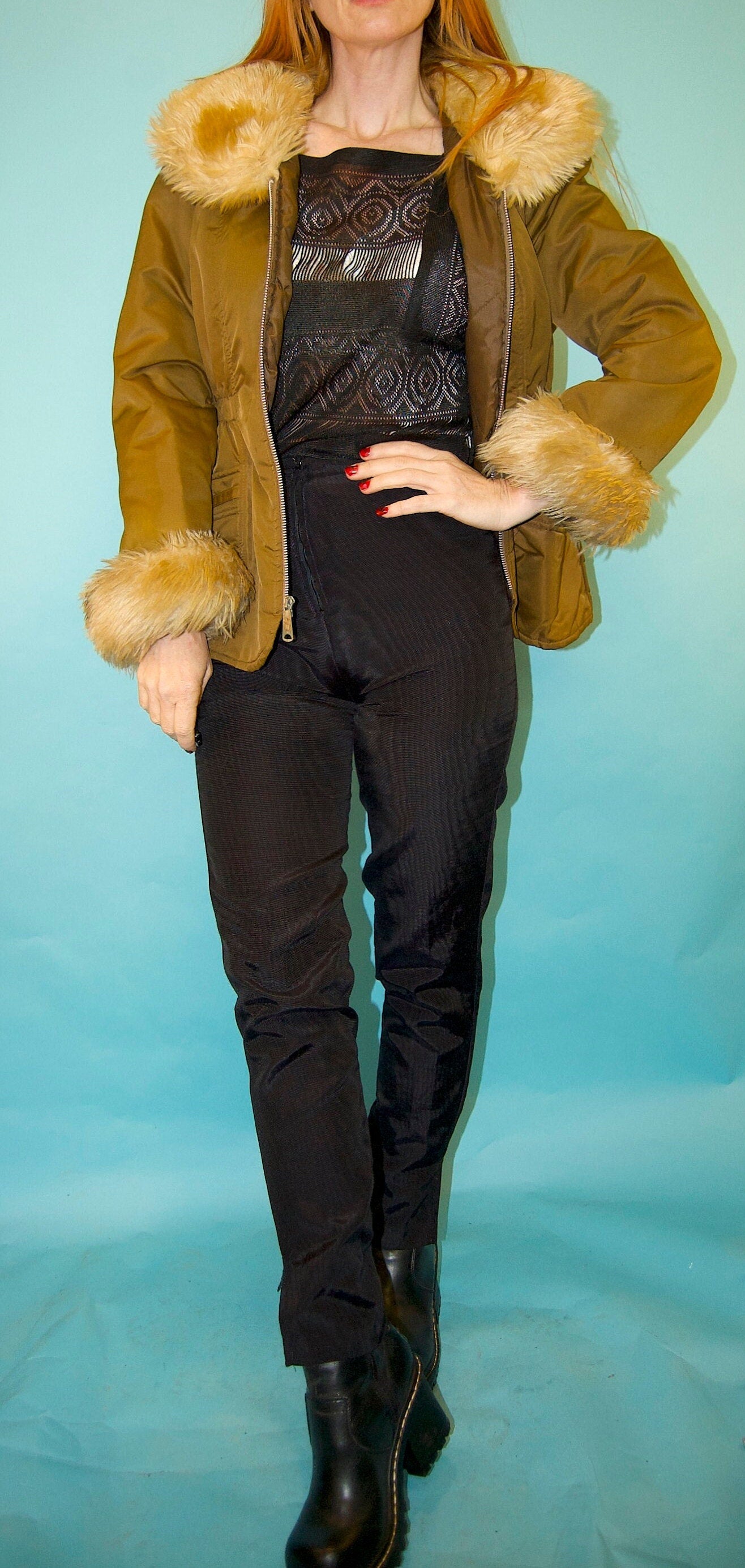 vtg 70s faux FUR PUFFER JACKET // fur trimmed nylon ski zip fashionable sporting coat pointy collar cropped winter penny lane style retro