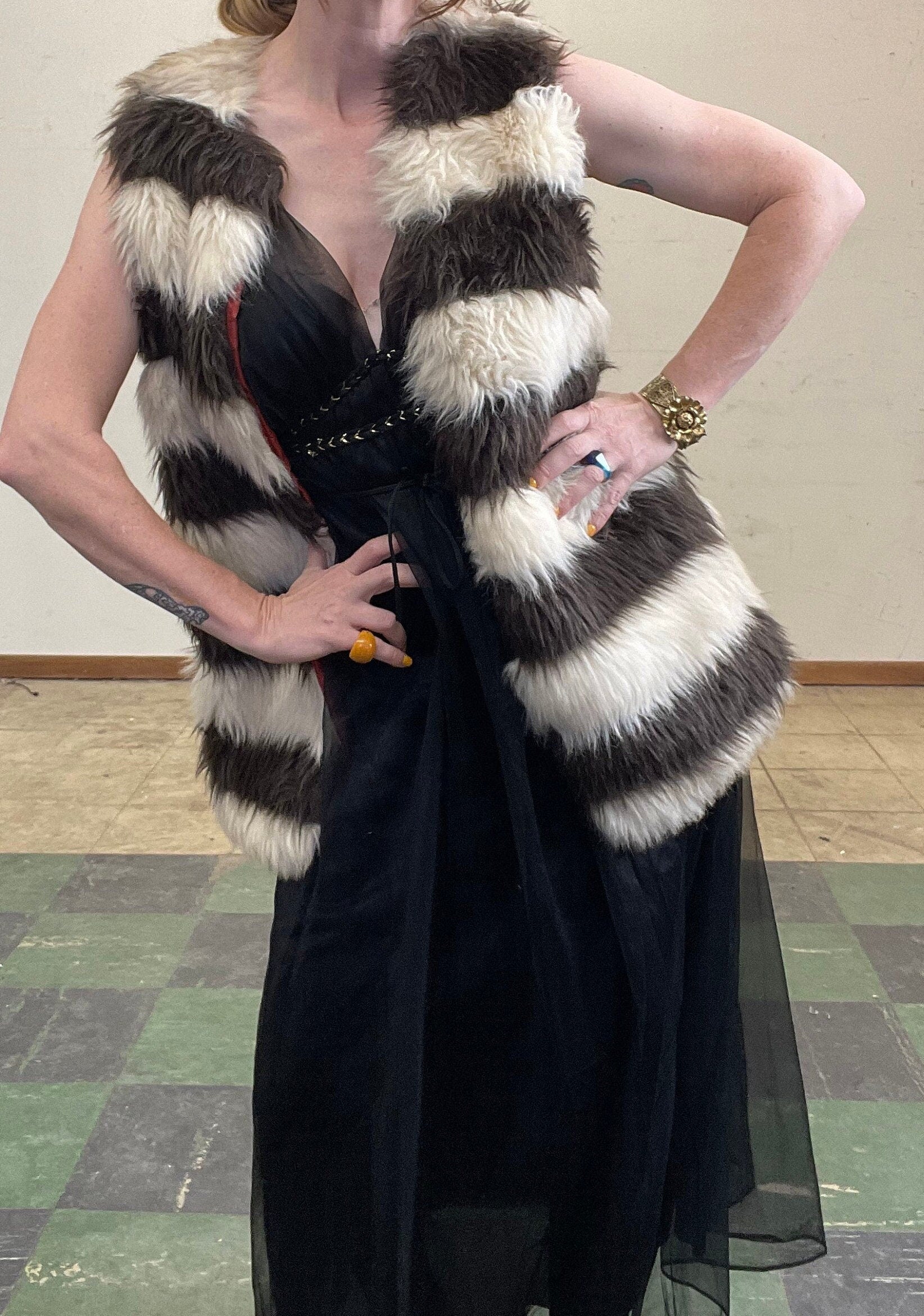 vtg 70s FAUX FUR STRIPED Vest // vintage shaggy zebra striped happy legs womens large fur coat autumn winter festive statement glam fashion