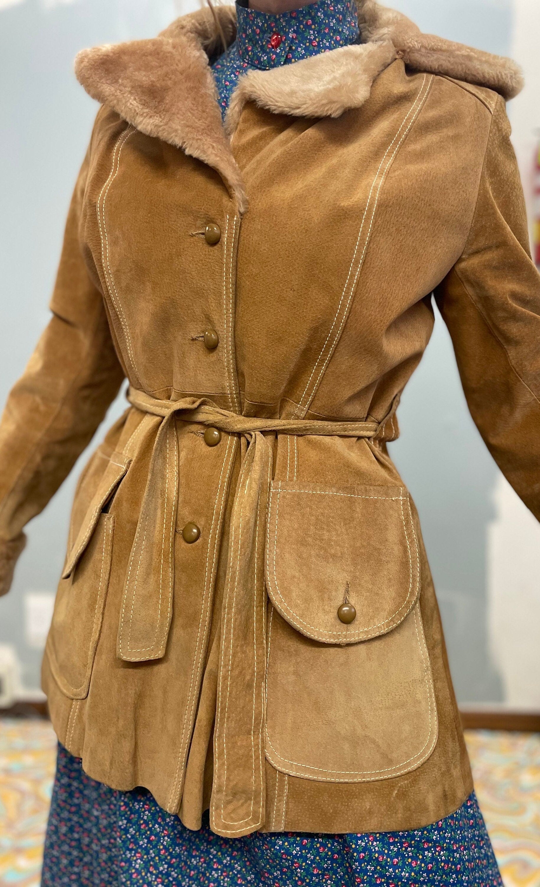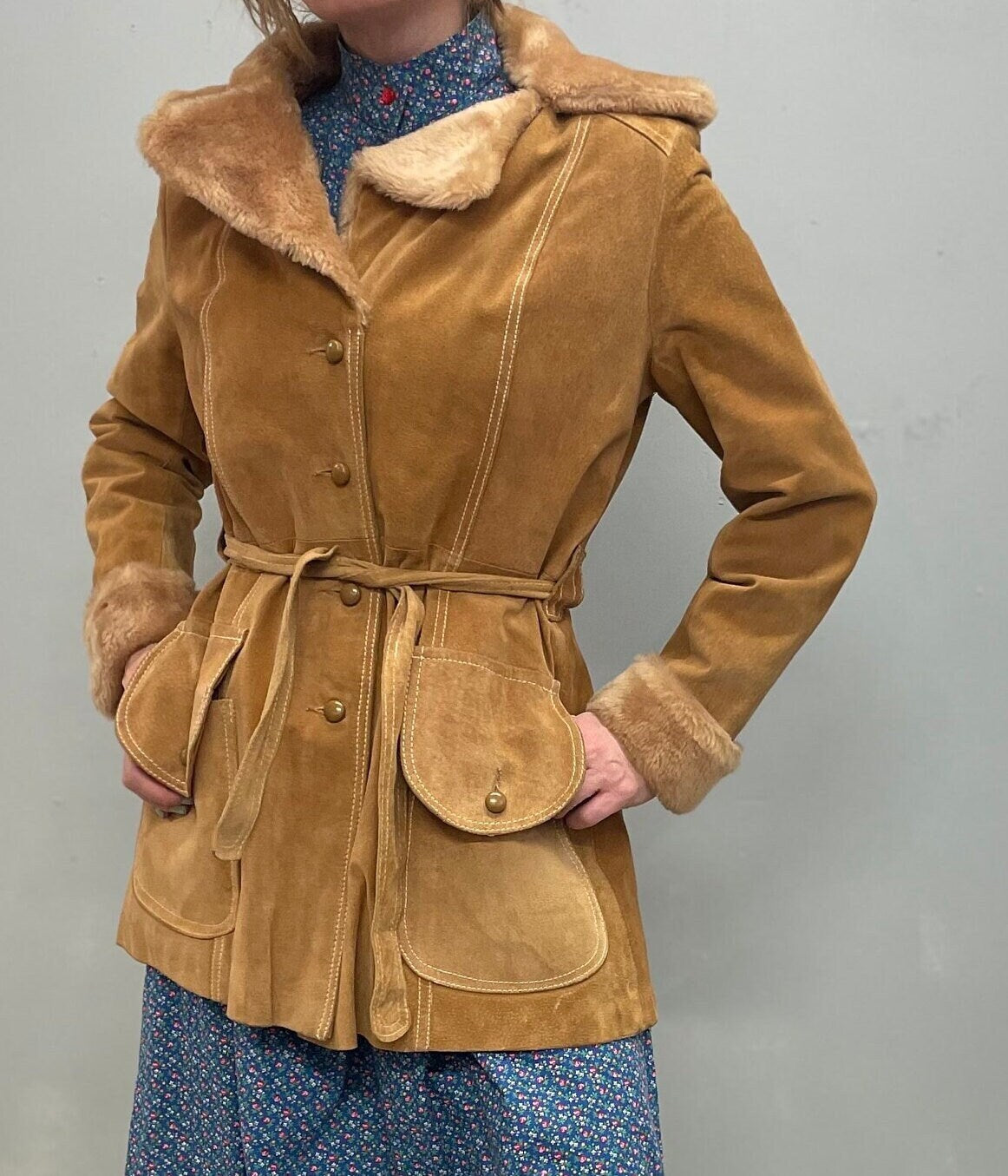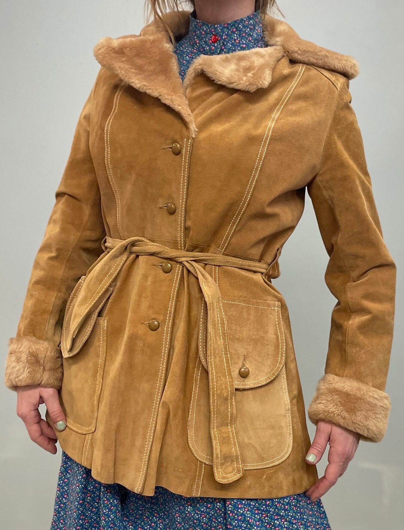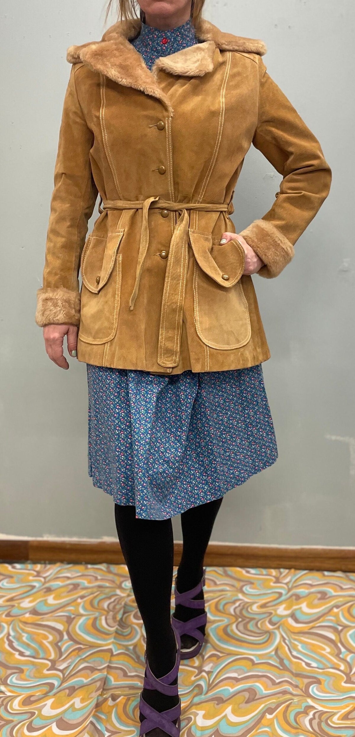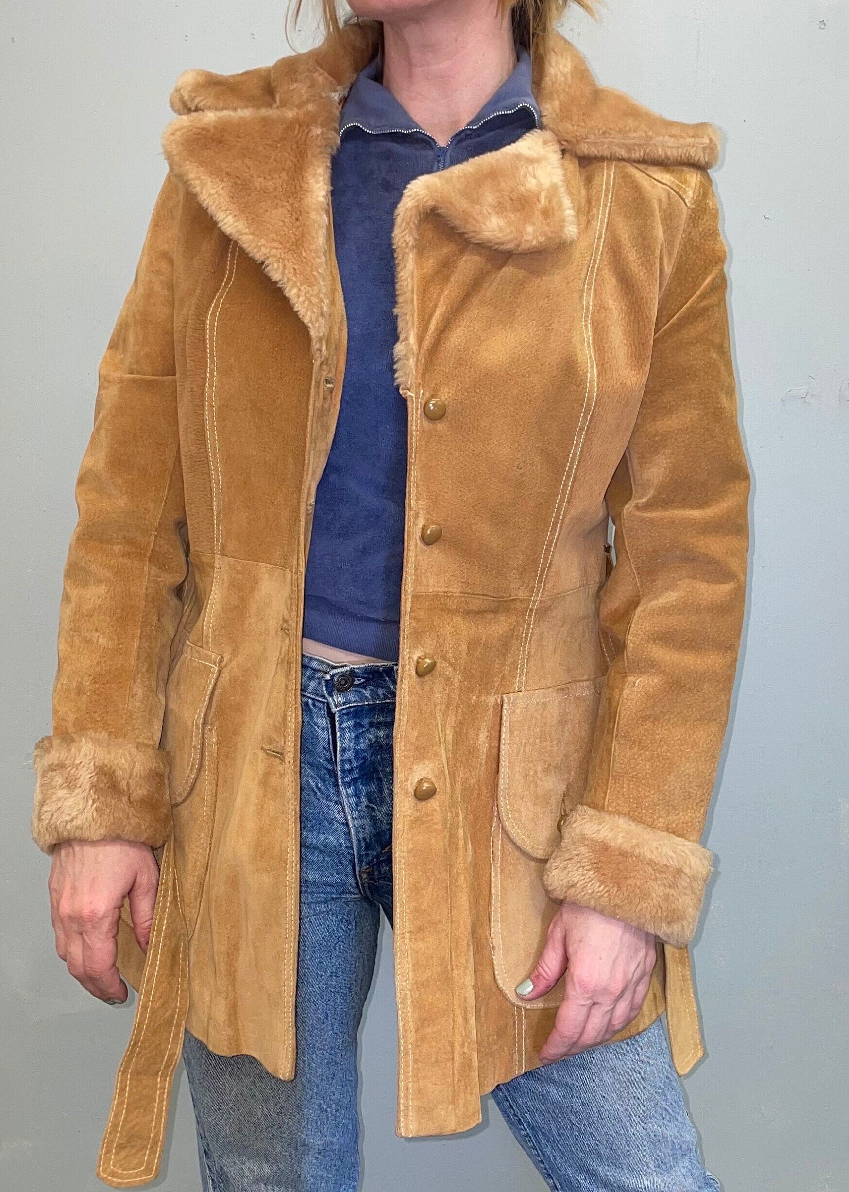 vtg 70s FAUX FUR TRIMMED Jacket // vintage medium womens belted butterfly collar button up suede leather fur cuff quilted gold plush coat