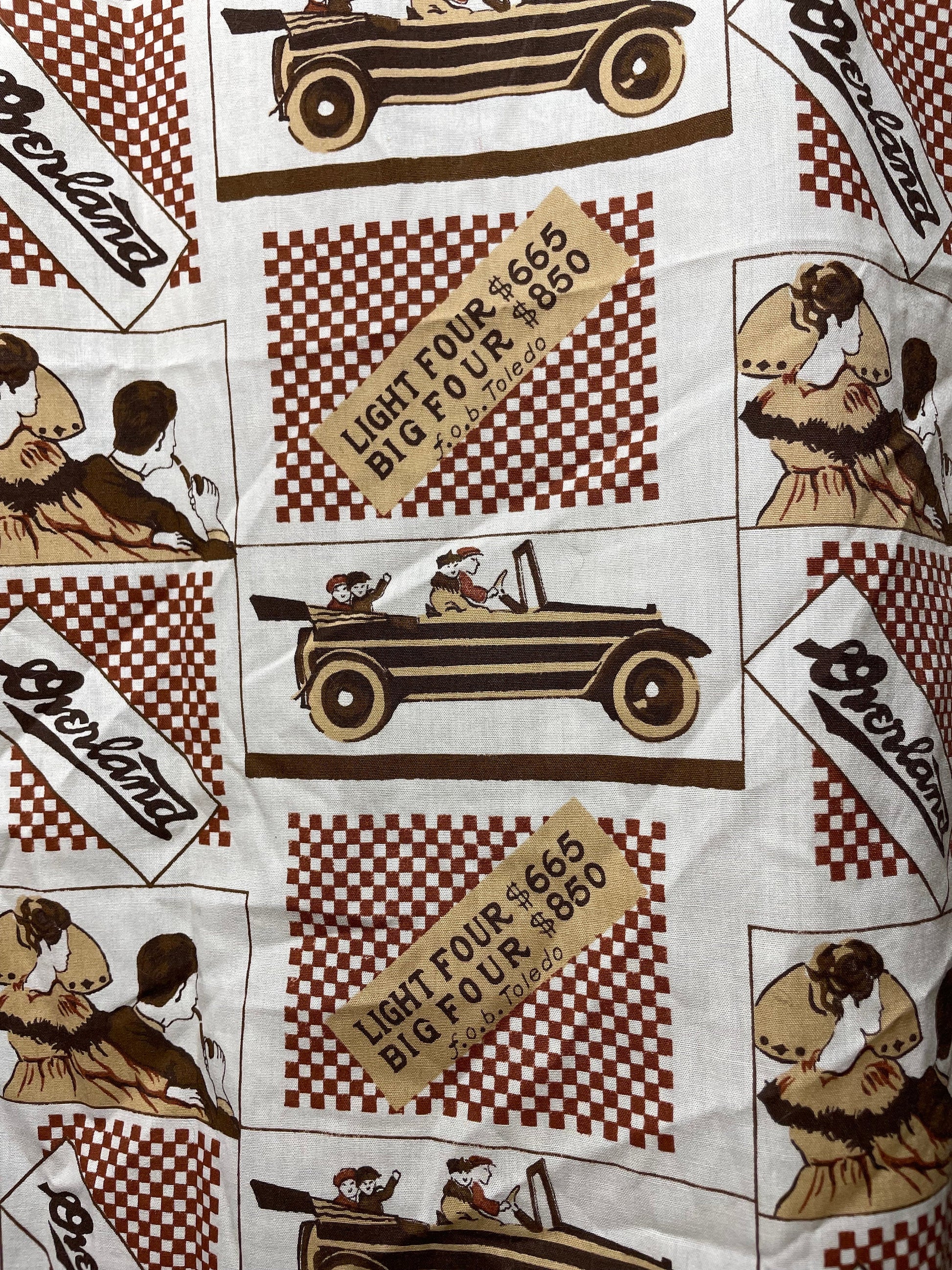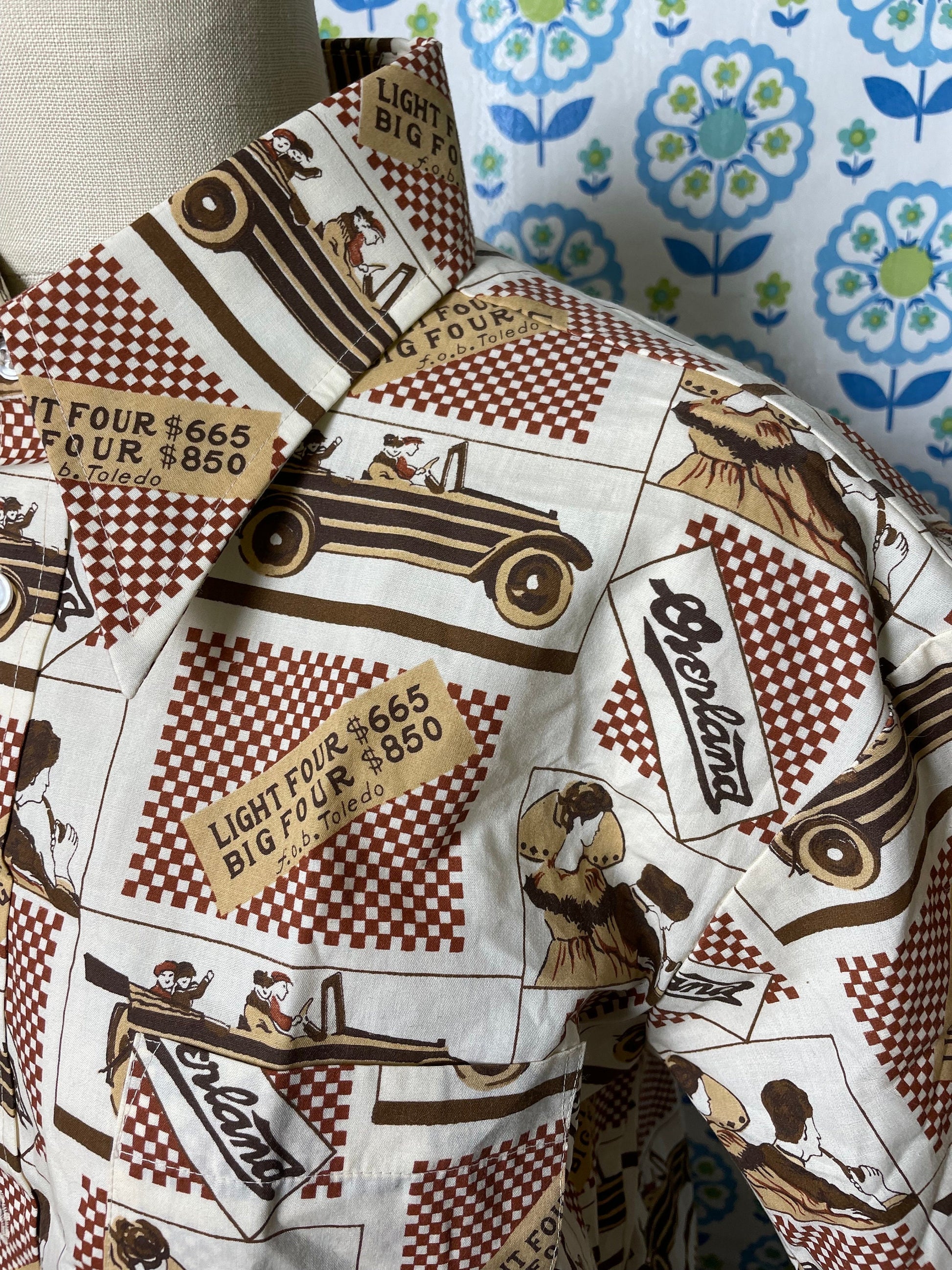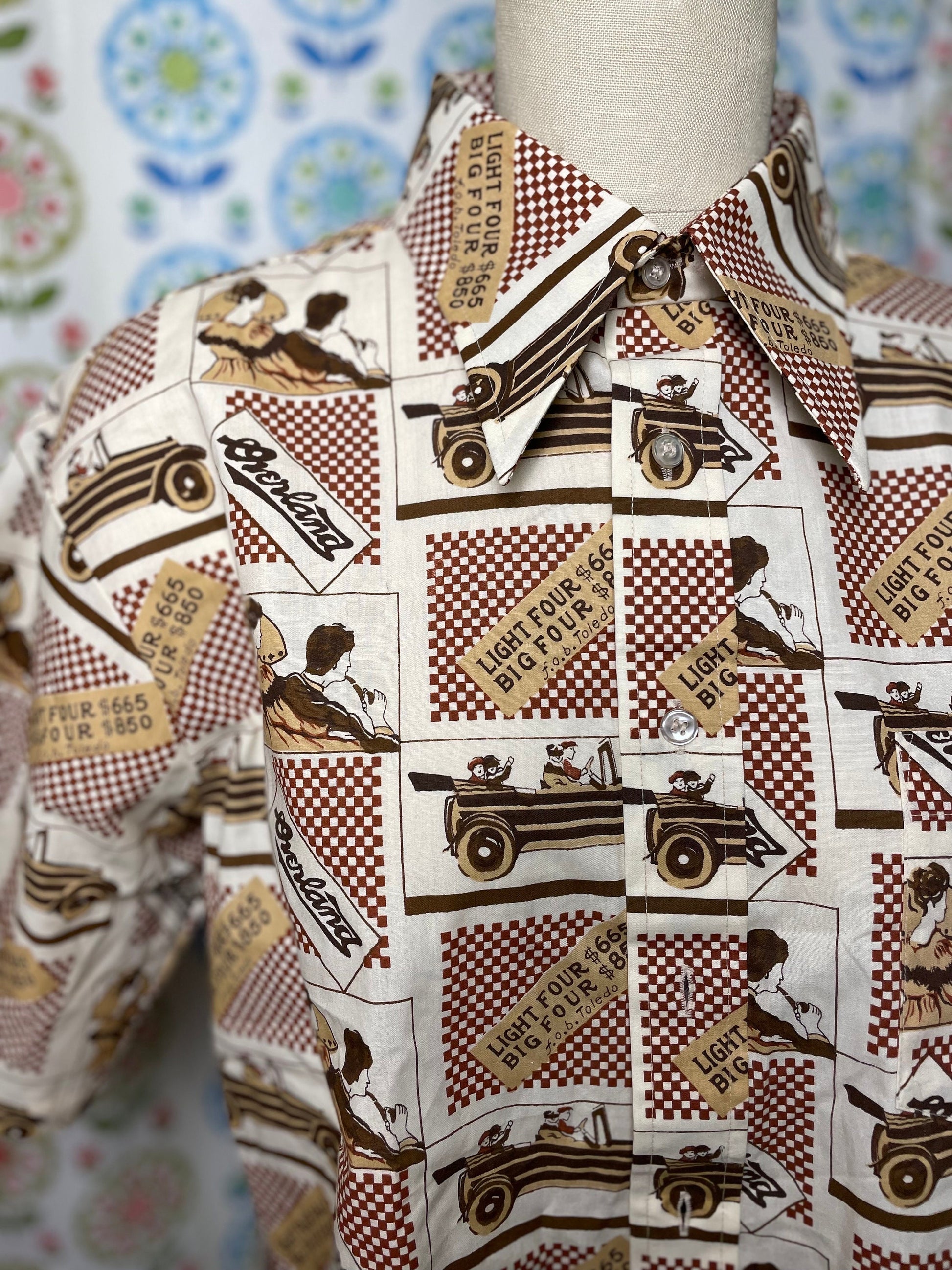 vtg 70s FLAPPER AOP PRINT // Overland light four big four Henry Ford Car All over print shirt loud antique collar automobile historic hair
