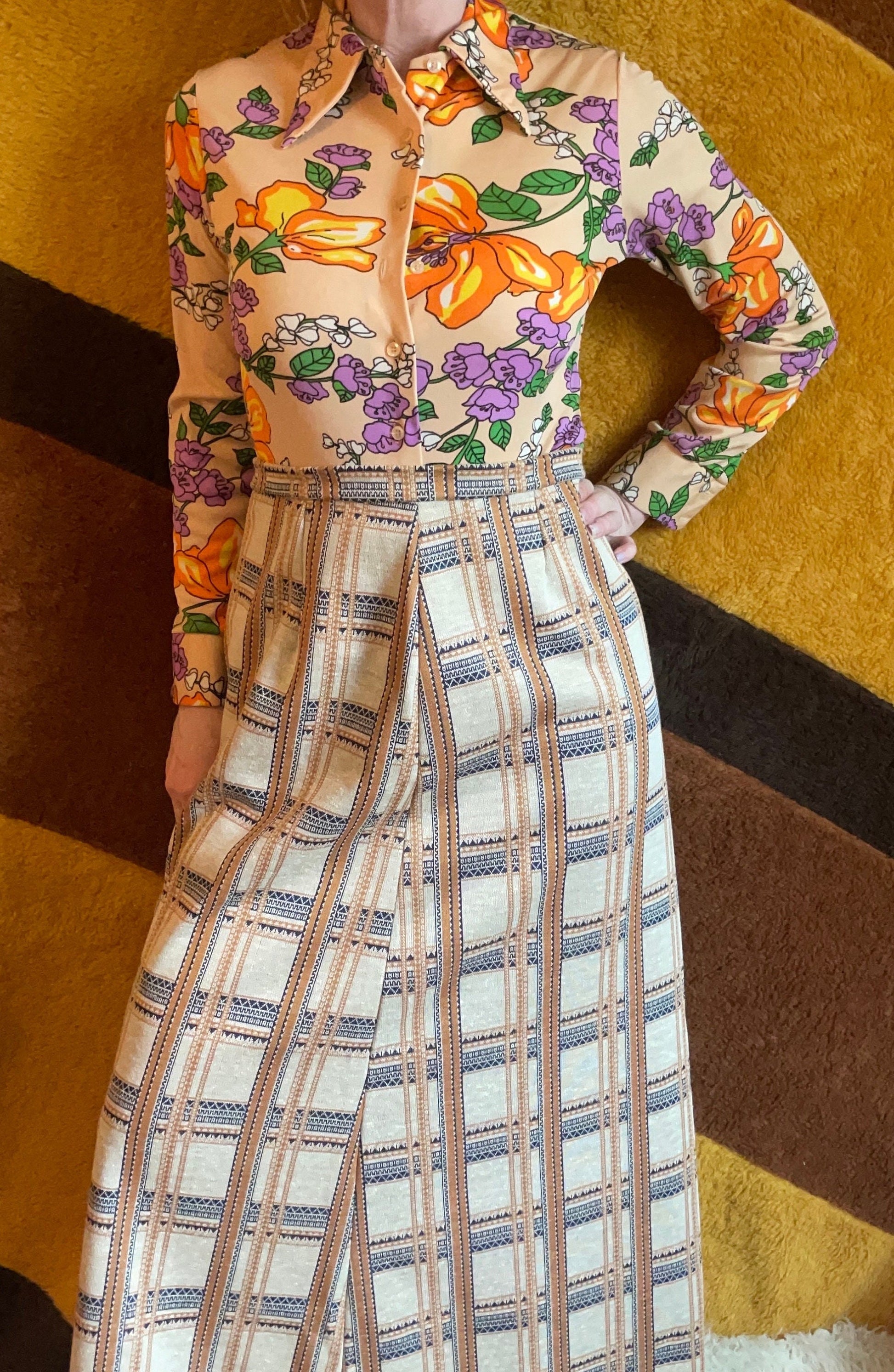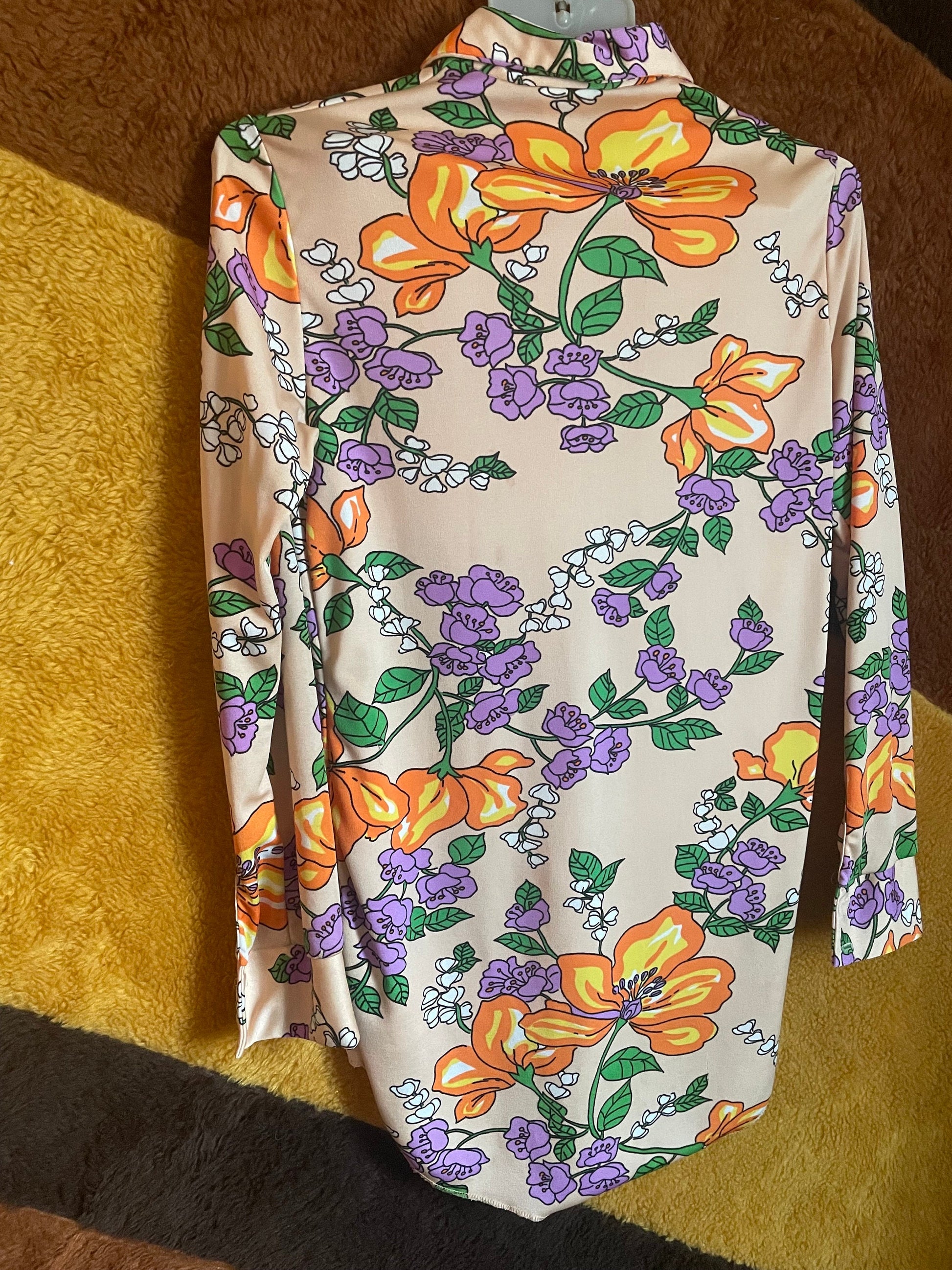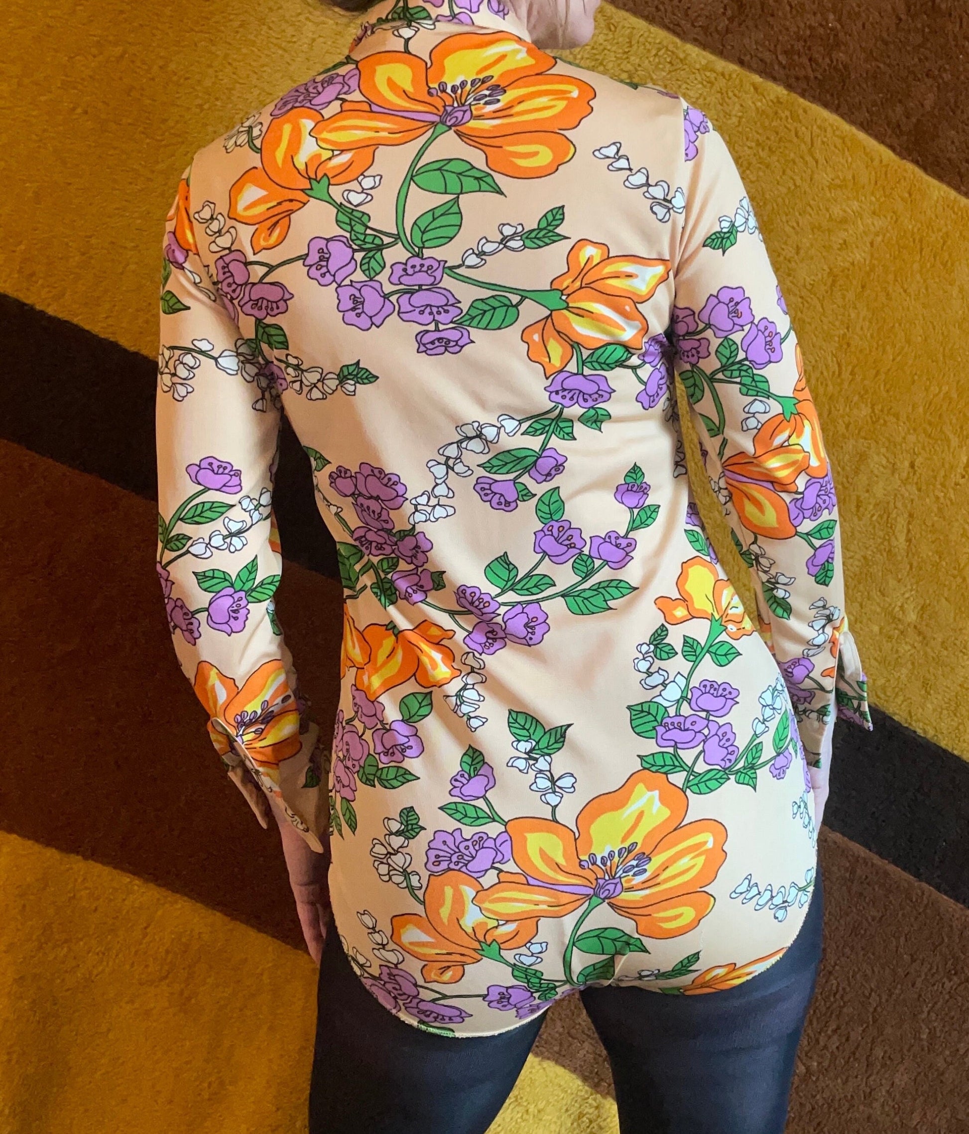 vtg 70s FLORAL BODYSUIT psychedelic top // long sleeve collared unitard look undershirt bright funky mod hippie kitschy retro spring romper