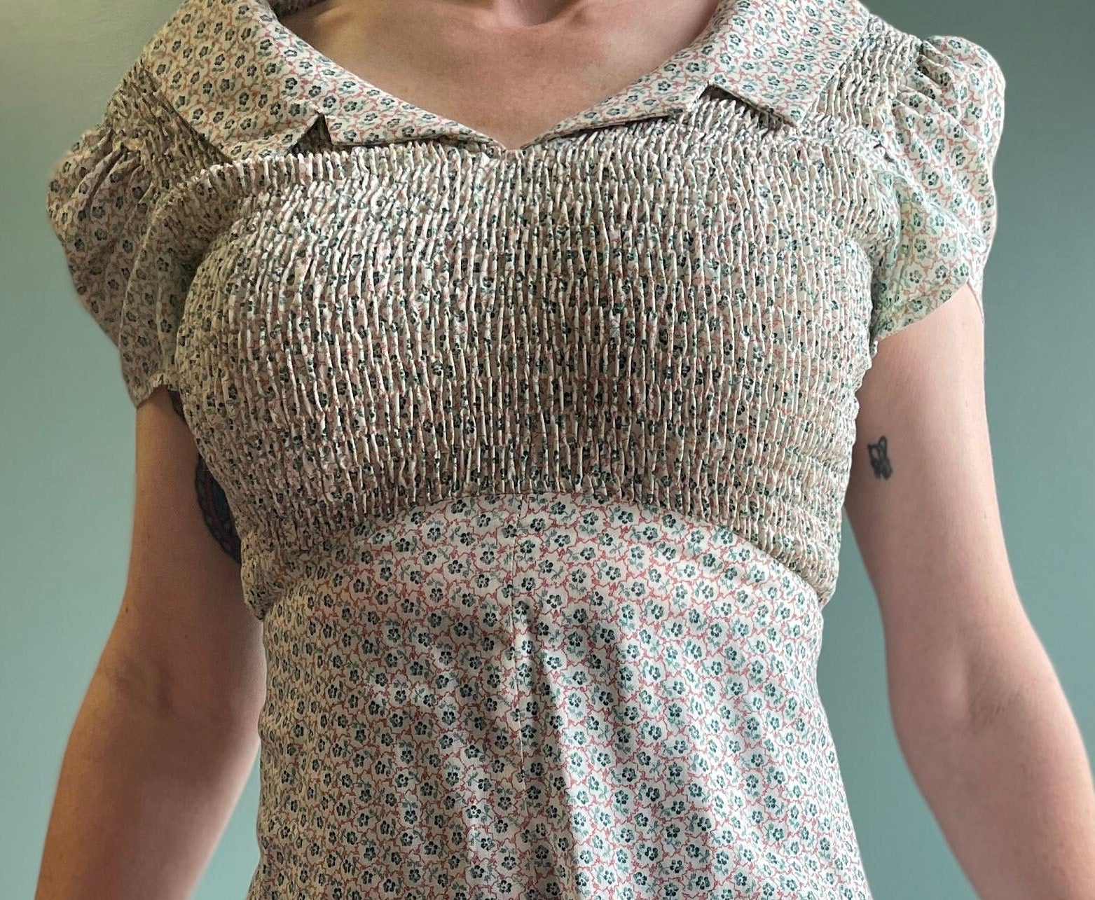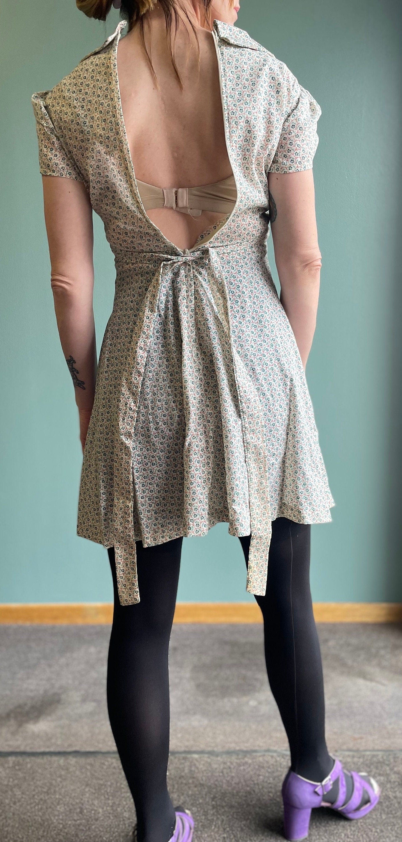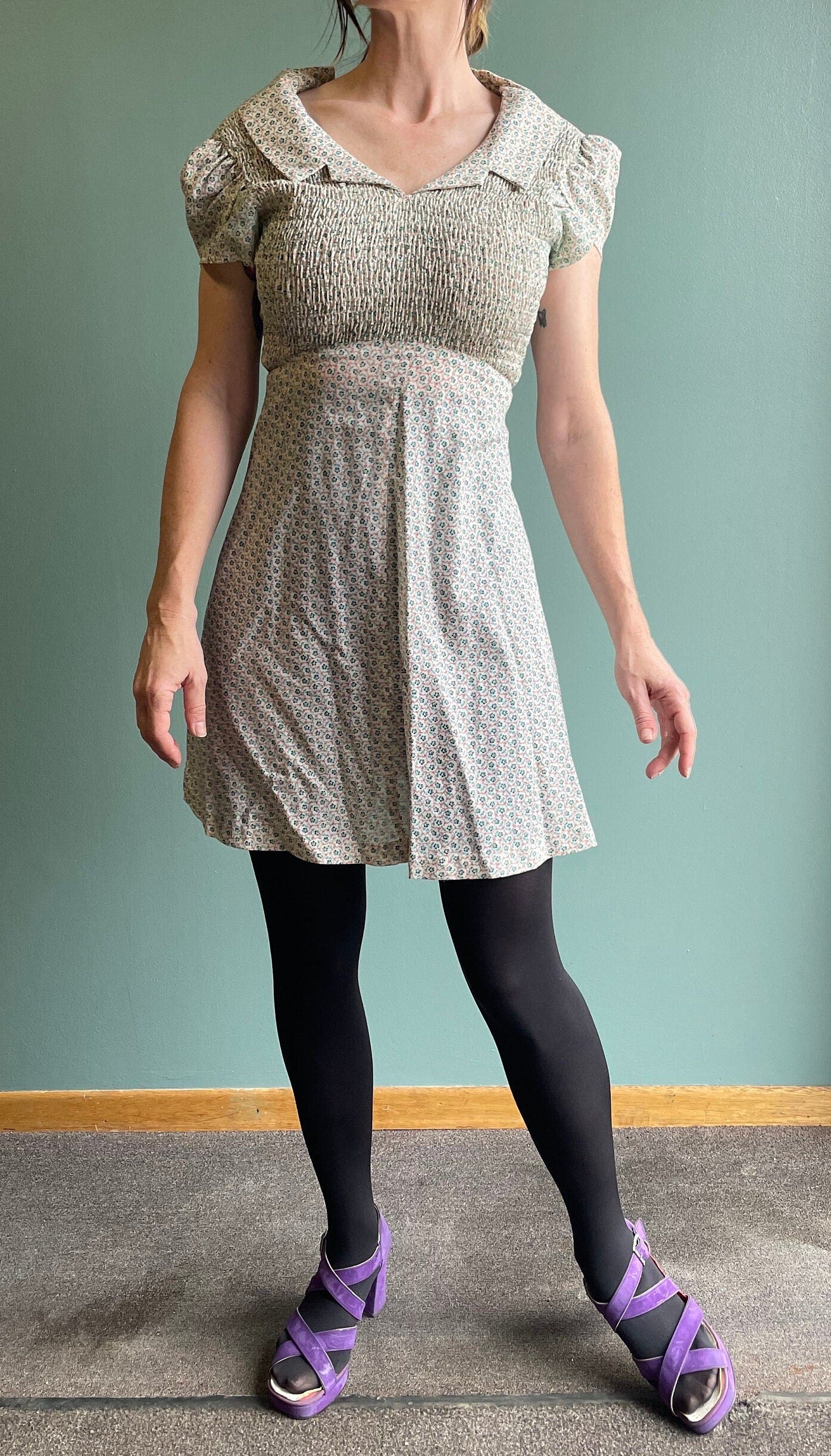 vtg 70s FLORAL DOLLY DRESS // vintage cute cinchy belted mini dress pan collar ditzy kitschy mod retro puffed sleeve neutral floral pattern