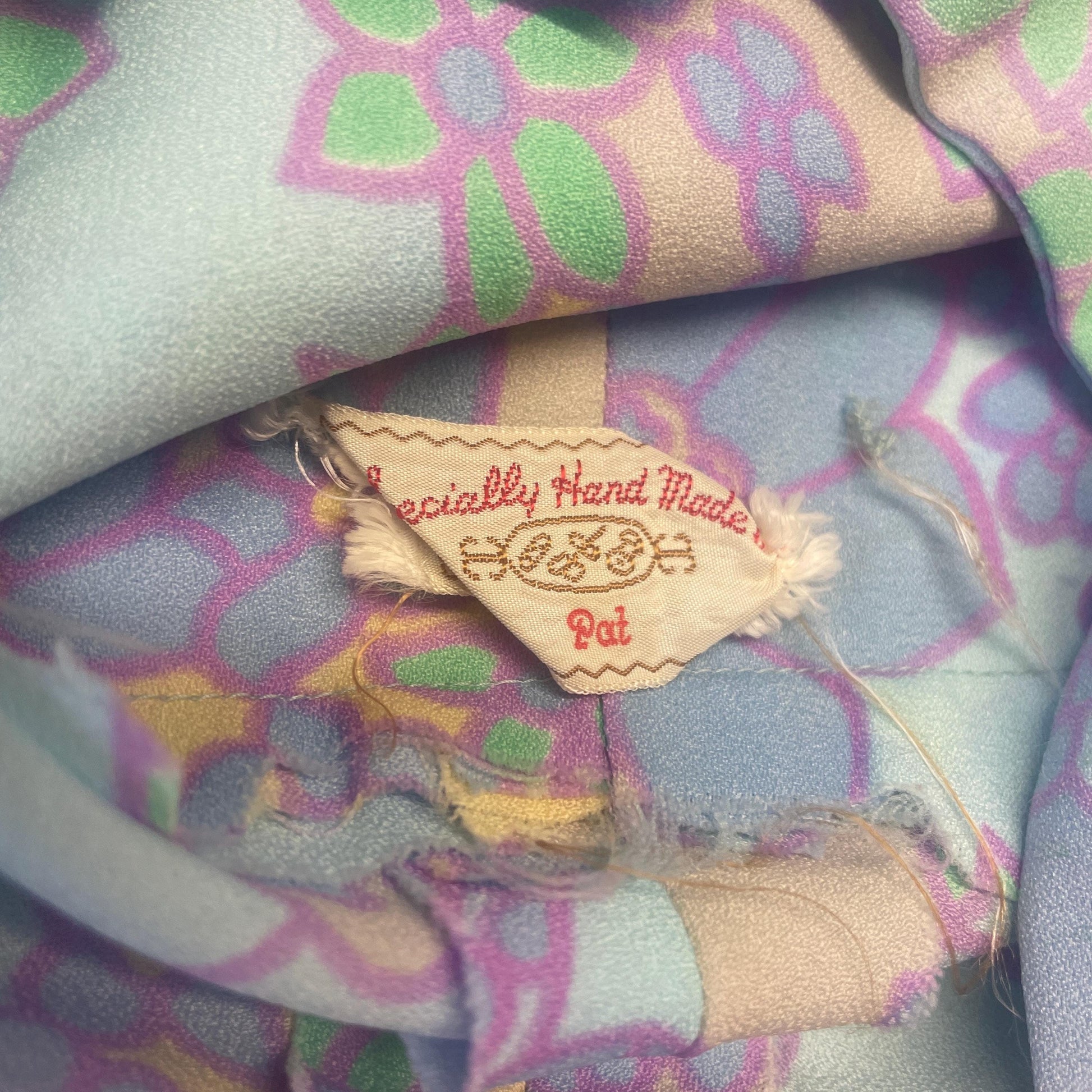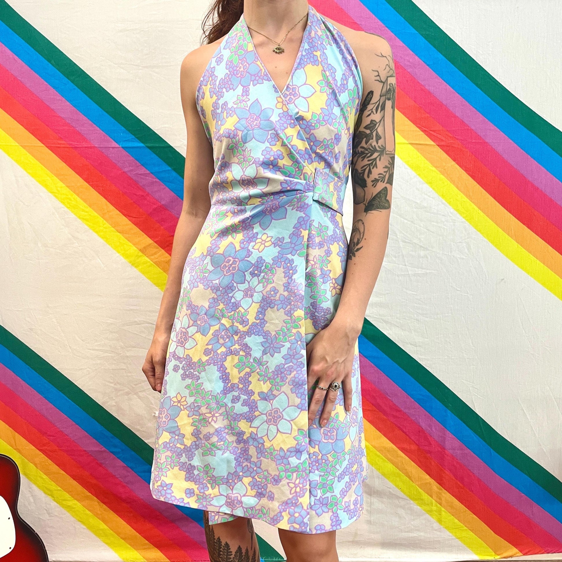 vtg 70s FLORAL HALTER WRAP dress // pastel flower power v neck wrap around lightweight flowy midi handmade retro bright pink & blue sexy