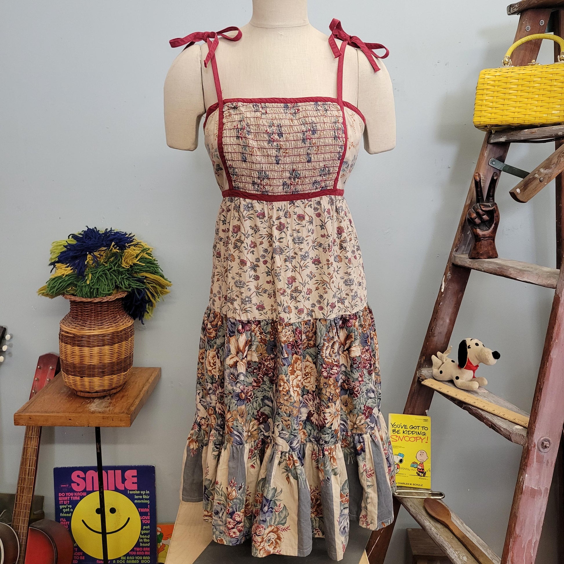 vtg 70s FLORAL PRAIRIE DRESS // vintage non stop union made womens small beige red tie strap tiered tank hippie boho prairie cottage style