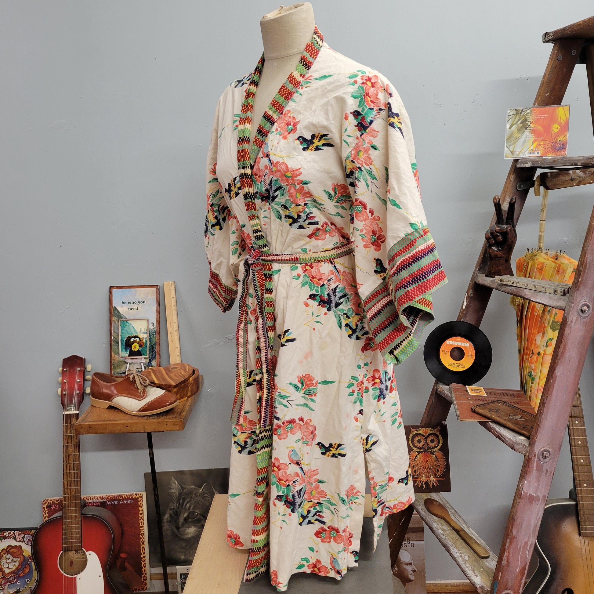 vtg 70s FLORAL WRAP DRESS // vintage Gilligan & O'Malley medium cotton kimono sleeve floral striped wrap around robe dress bohemian retro