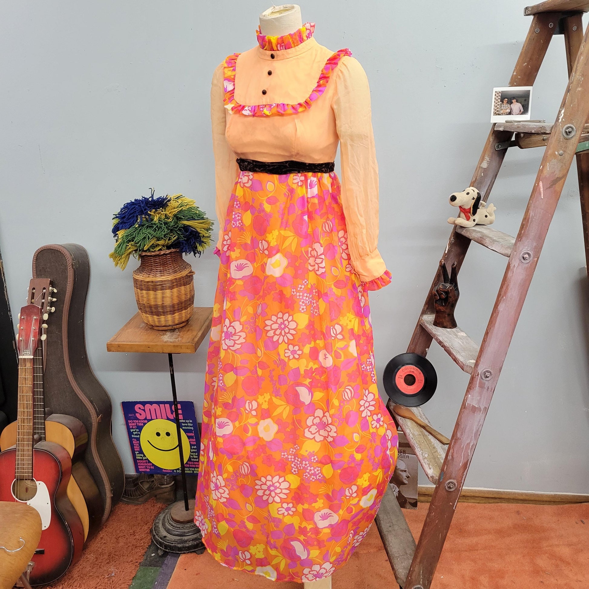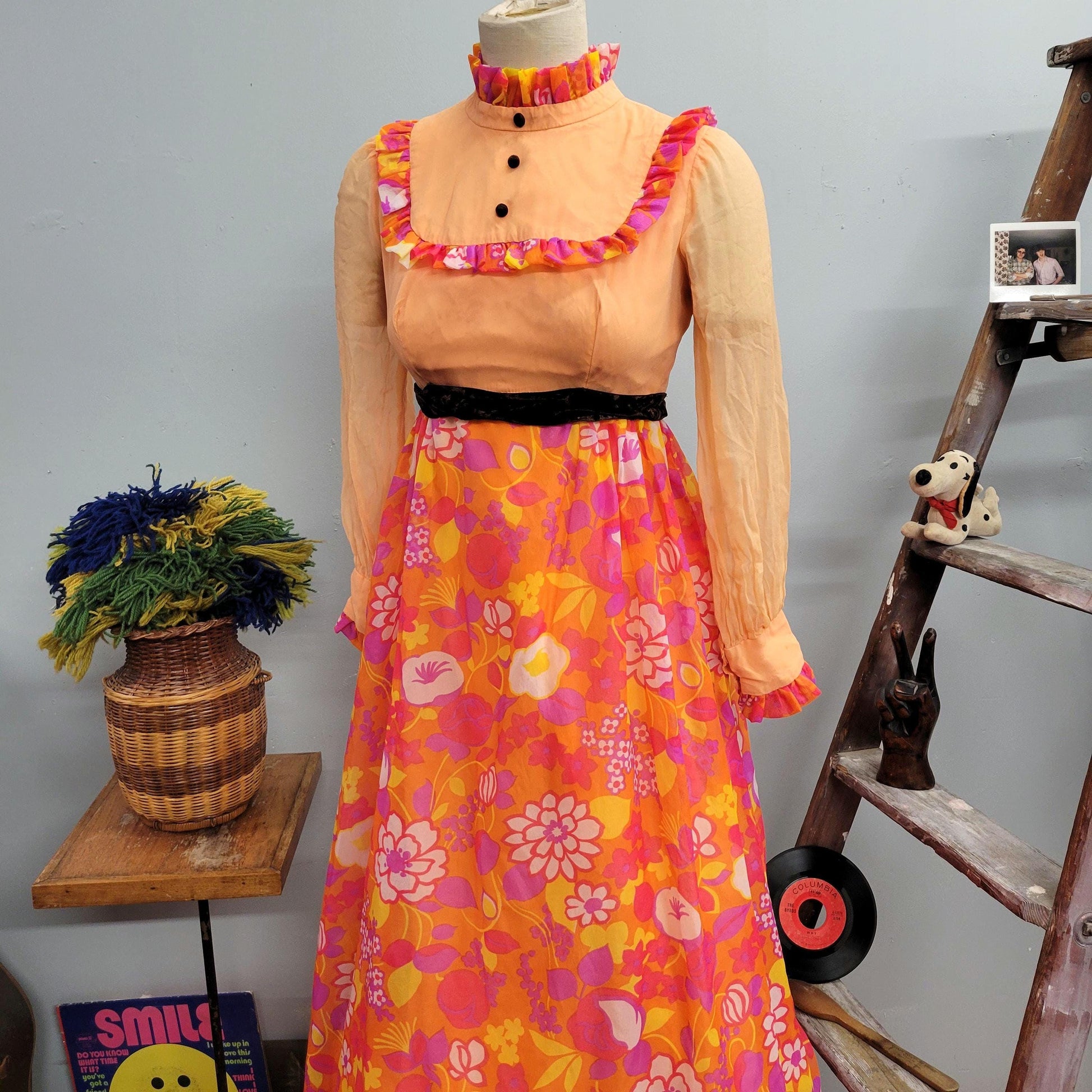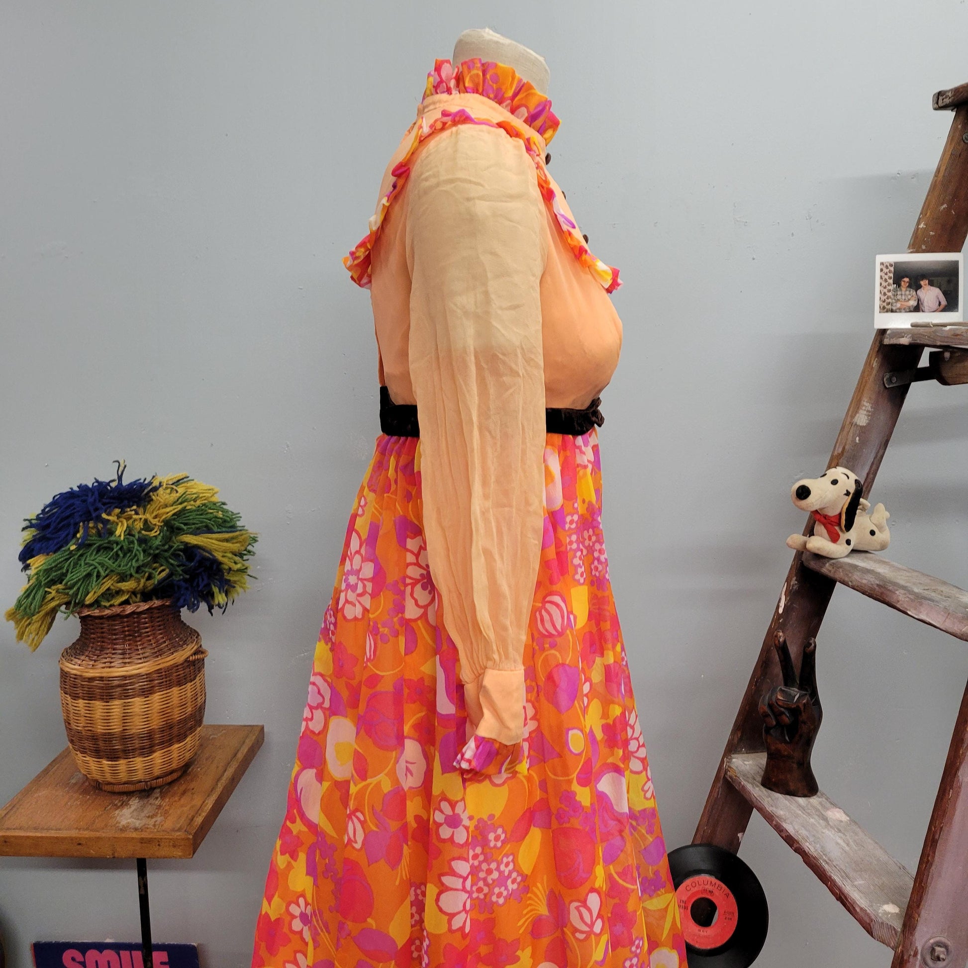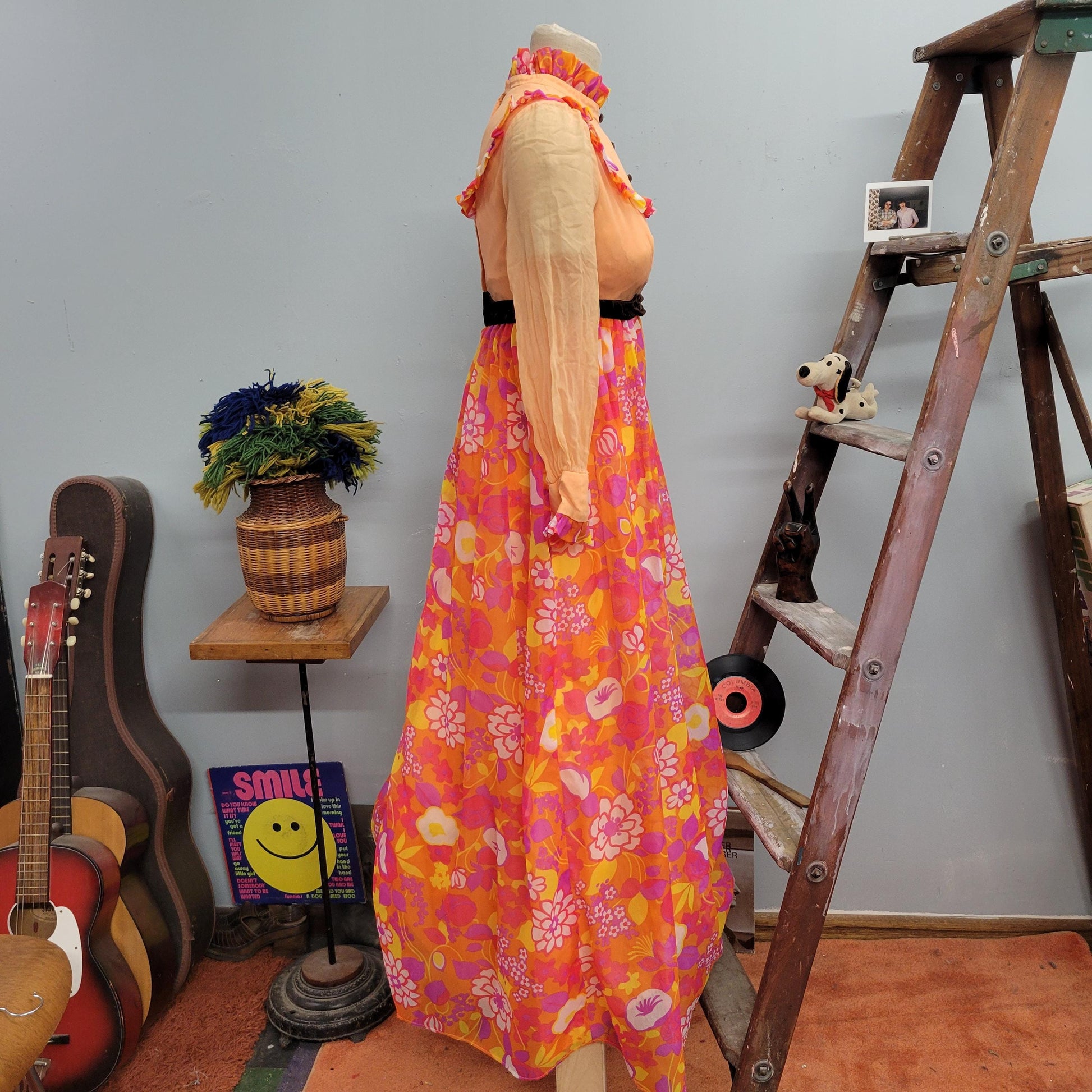 vtg 70s FLOWER POWER DRESS // vintage small womens psychedelic ruffle collar sheer sleeve chiffon bright flower power maxi full length gown