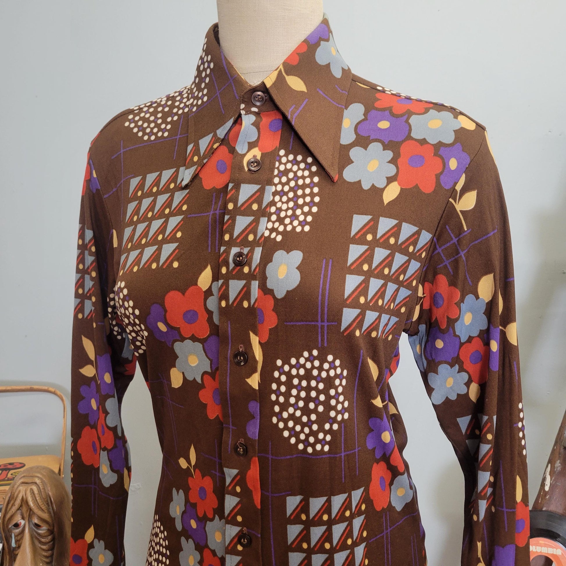 vtg 70s FLOWER POWER TOP // vintage button down masterbuilt medium autumn style abstract psychedelic retro pointy collared hippie mod style