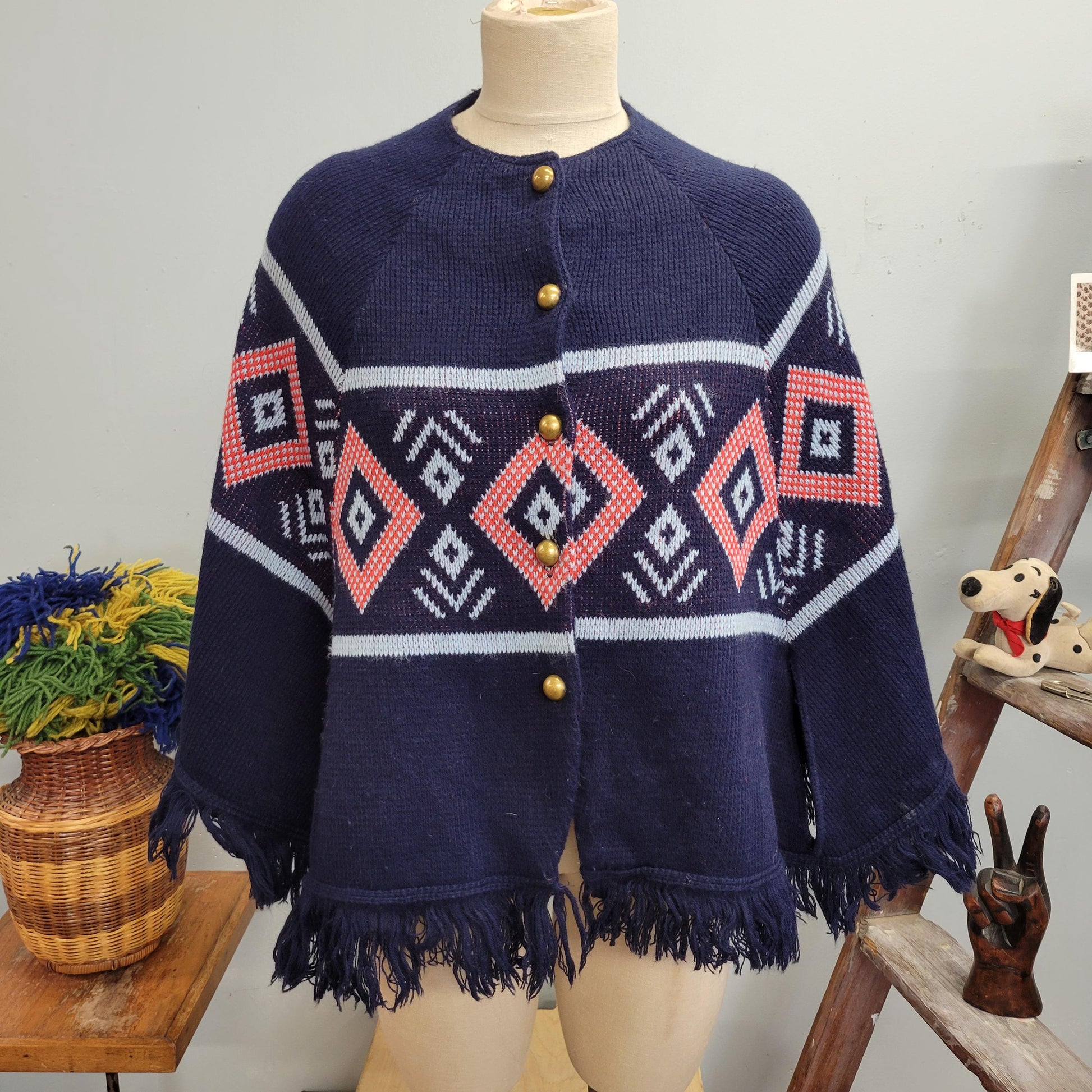 vtg 70s FRINGE PONCHO SWEATER // vintage abstract geometric pattern button up shaggy cape retro hippie mod autumn winter knit cardigan top