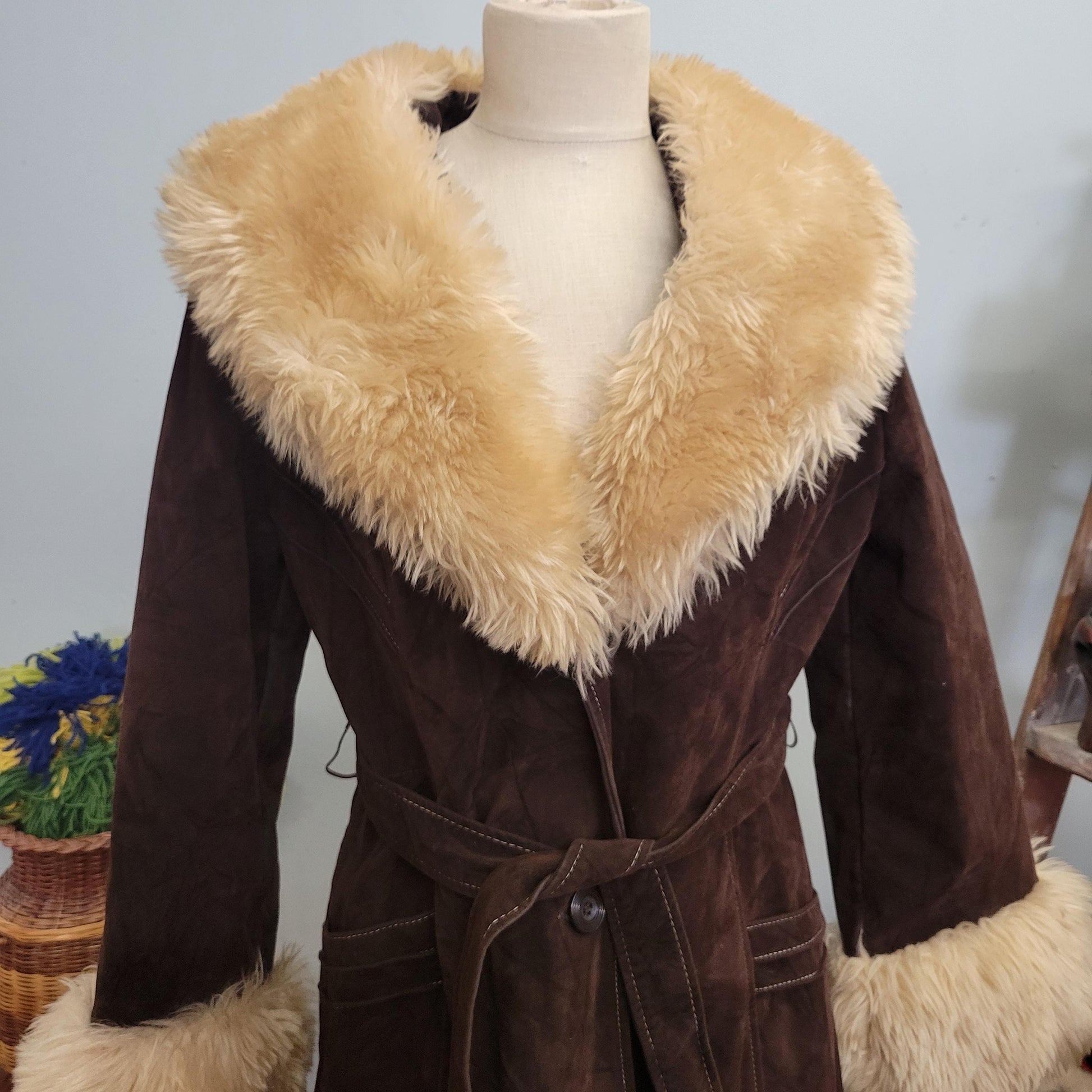 vtg 70s FUR SUEDE COAT // vintage medium penny lane large collar big arm cuffs chocolate brown fur trimmed stroller coat belted boho duster