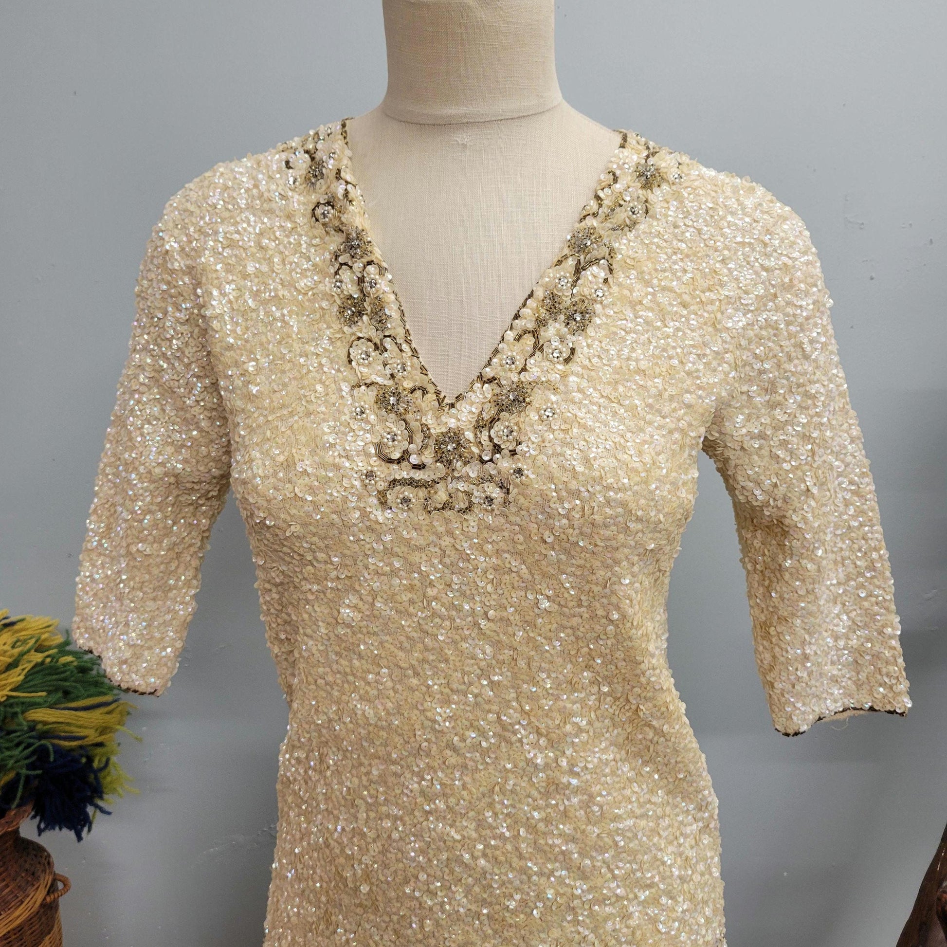 vtg 70s GENE SHELLY MINI Dress // vintage fully sequined gene shellys boutque internationale deep vee ivory tunic micro mini beaded blouse