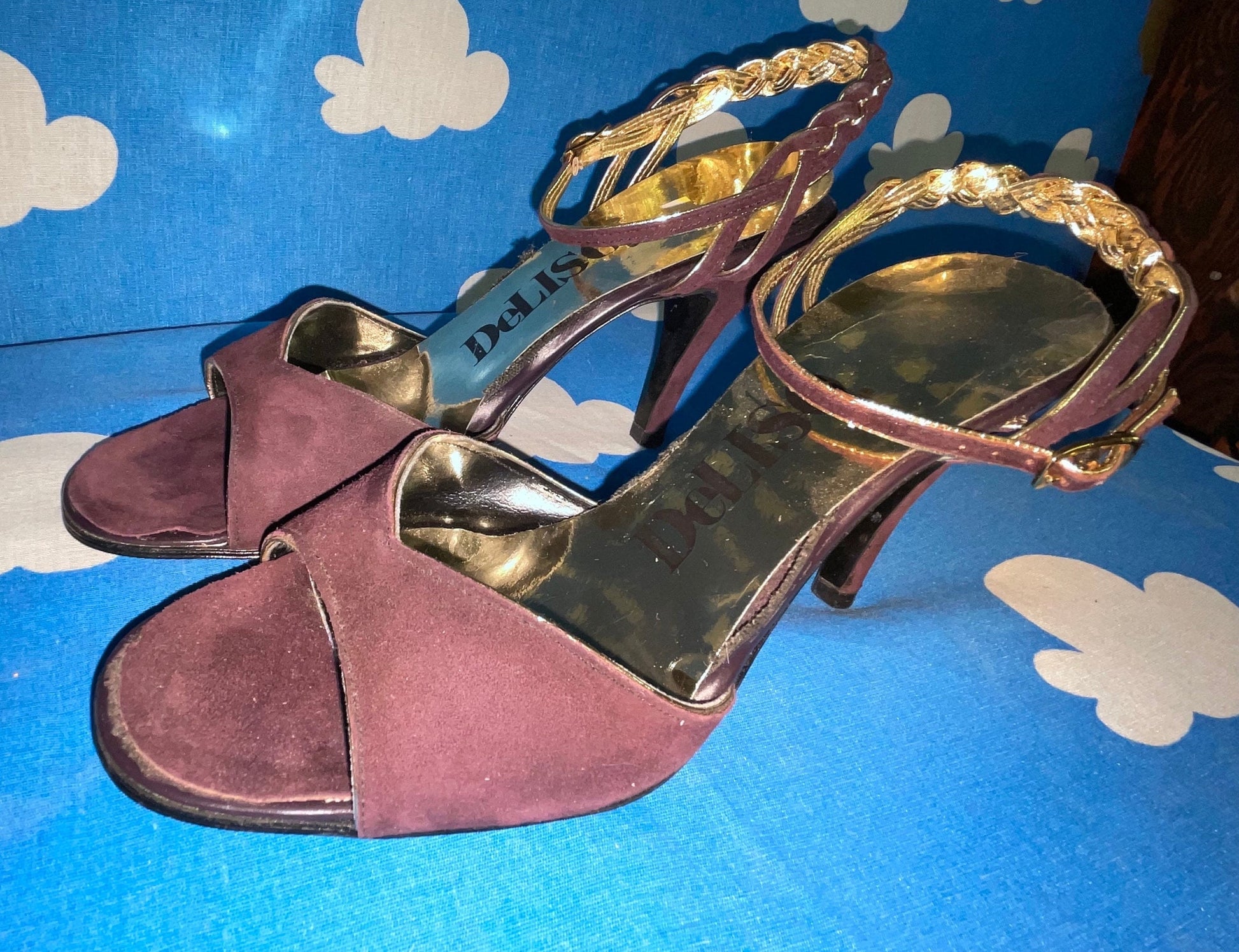 Vintage 70s Suede Purple Disco Heels / Gold Trimmed Dainty Heels / Purple Suede Strappy Fancy Heels