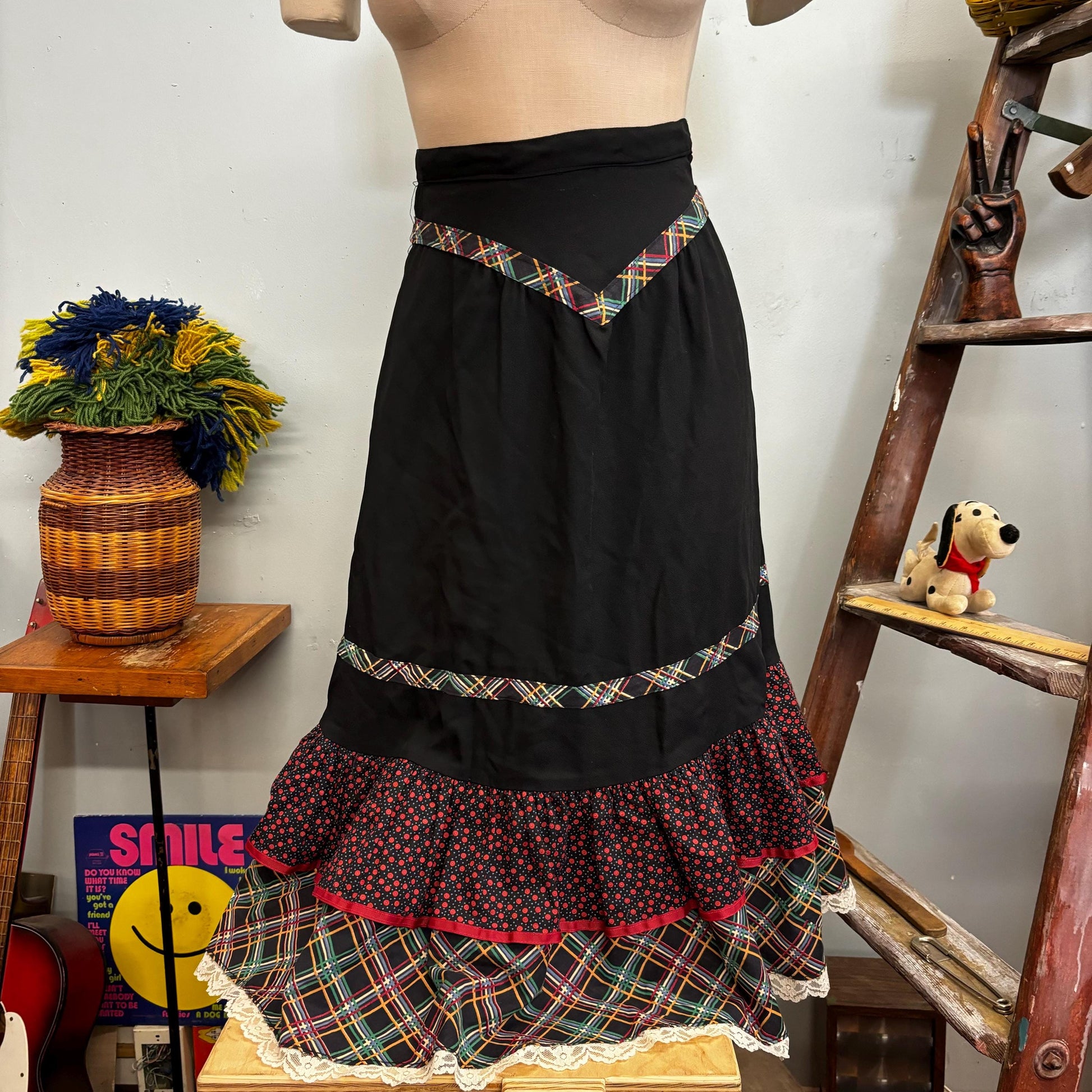 vtg 70s GUNNIES RAYON FLORAL Skirt // vintage rare black slinky rayon tiered plaid lace hippie goth autumn fashion midi length prairie dress