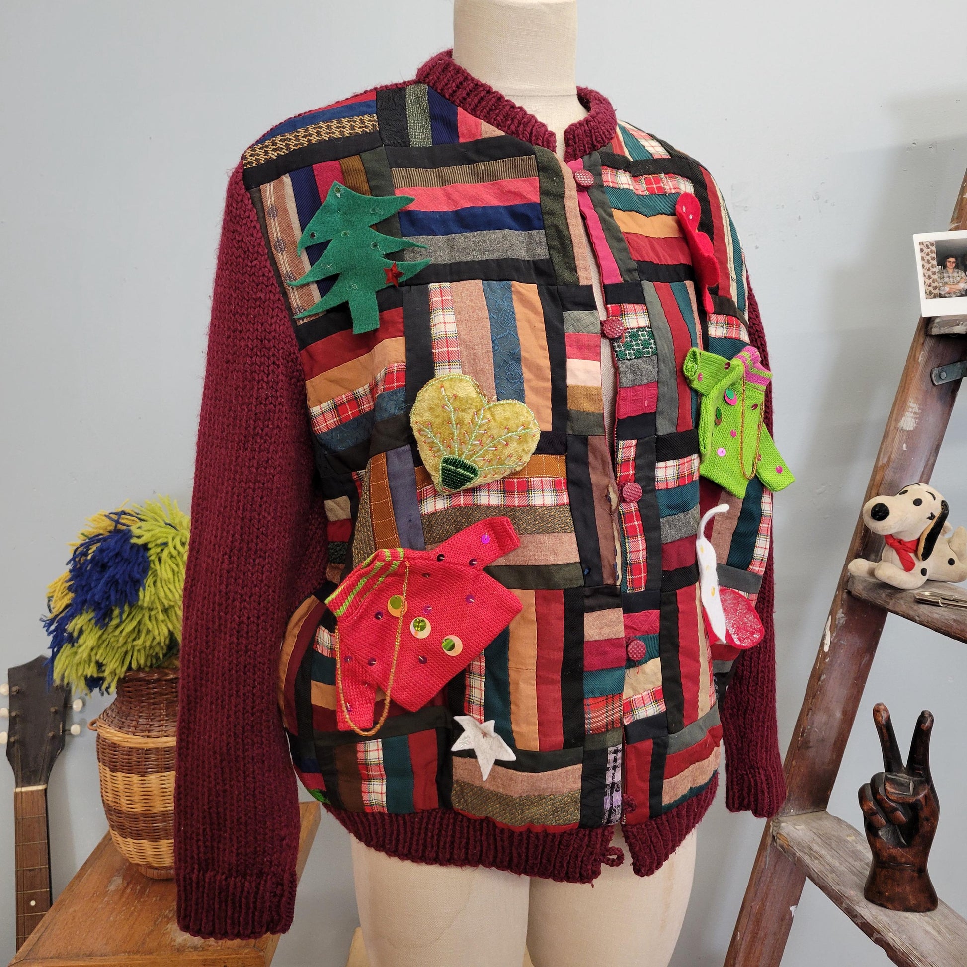 vtg 70s HANDMADE HOLIDAY SWEATER // vintage large patchwork blanket cardigan original by darlene noerenberg large button up ugly xmas granny