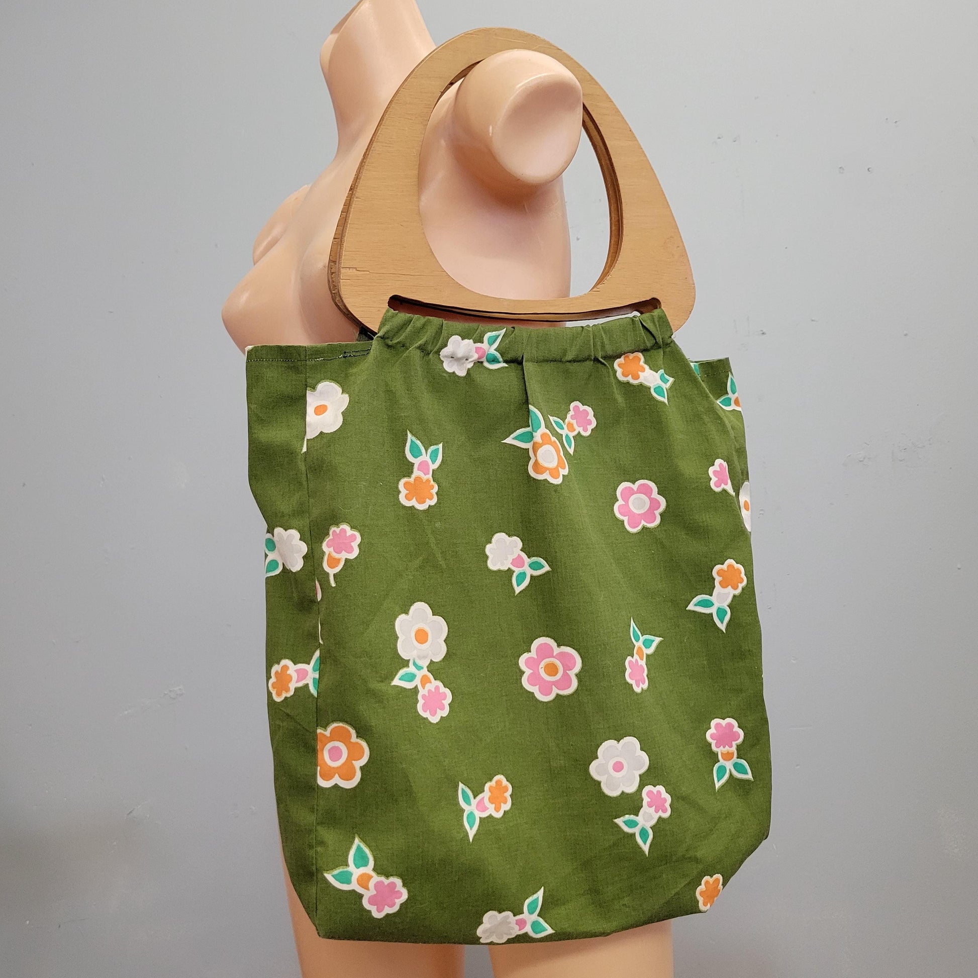 vtg 70s LARGE FLORAL PURSE // vintage green pink flowers wooden top handle boho hippie retro fabric bag cute autumn vibes flower power 60s