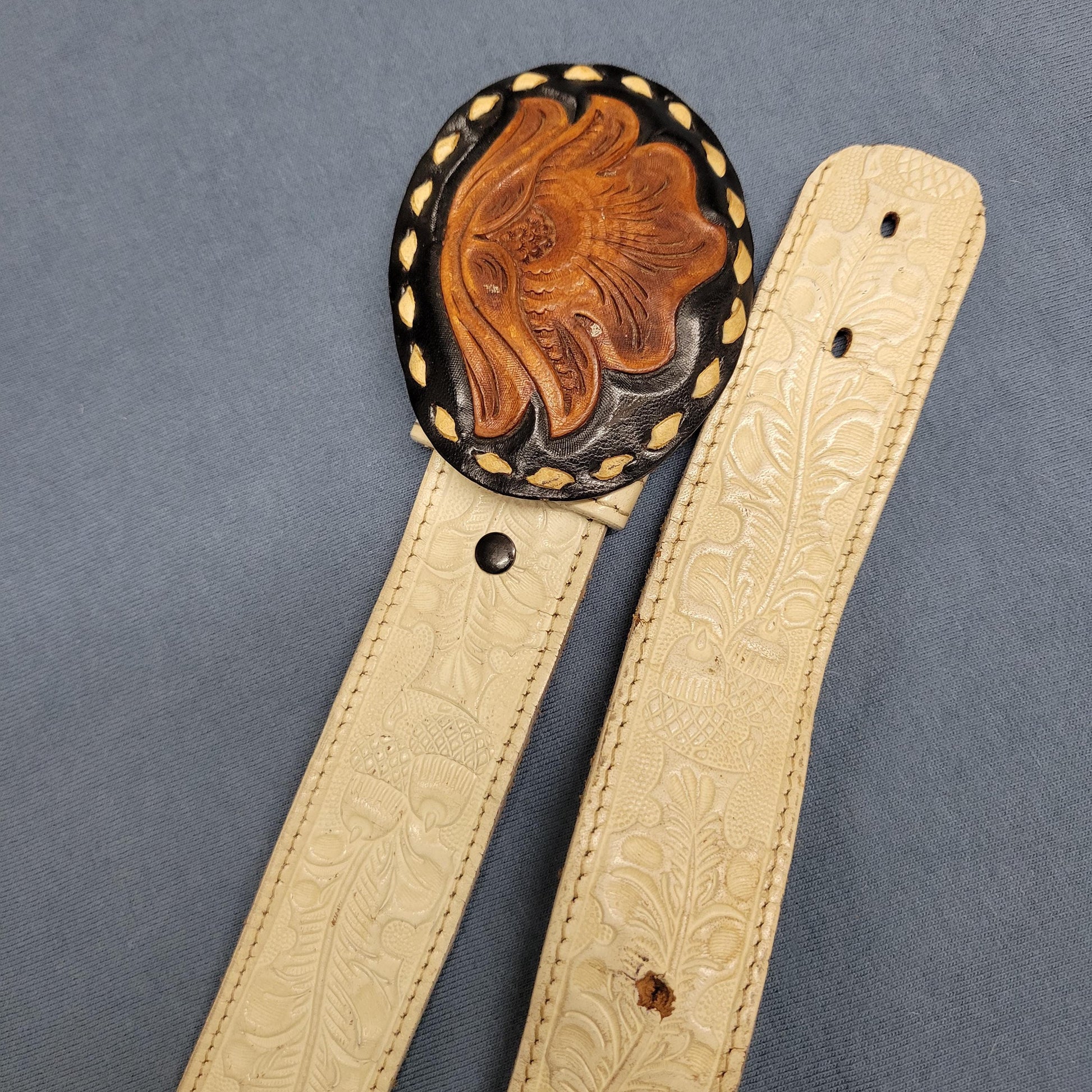 vtg 70s LEATHER FLORAL BELT // vintage white hand tooled western hippie boho belt and round leather lotus buckle