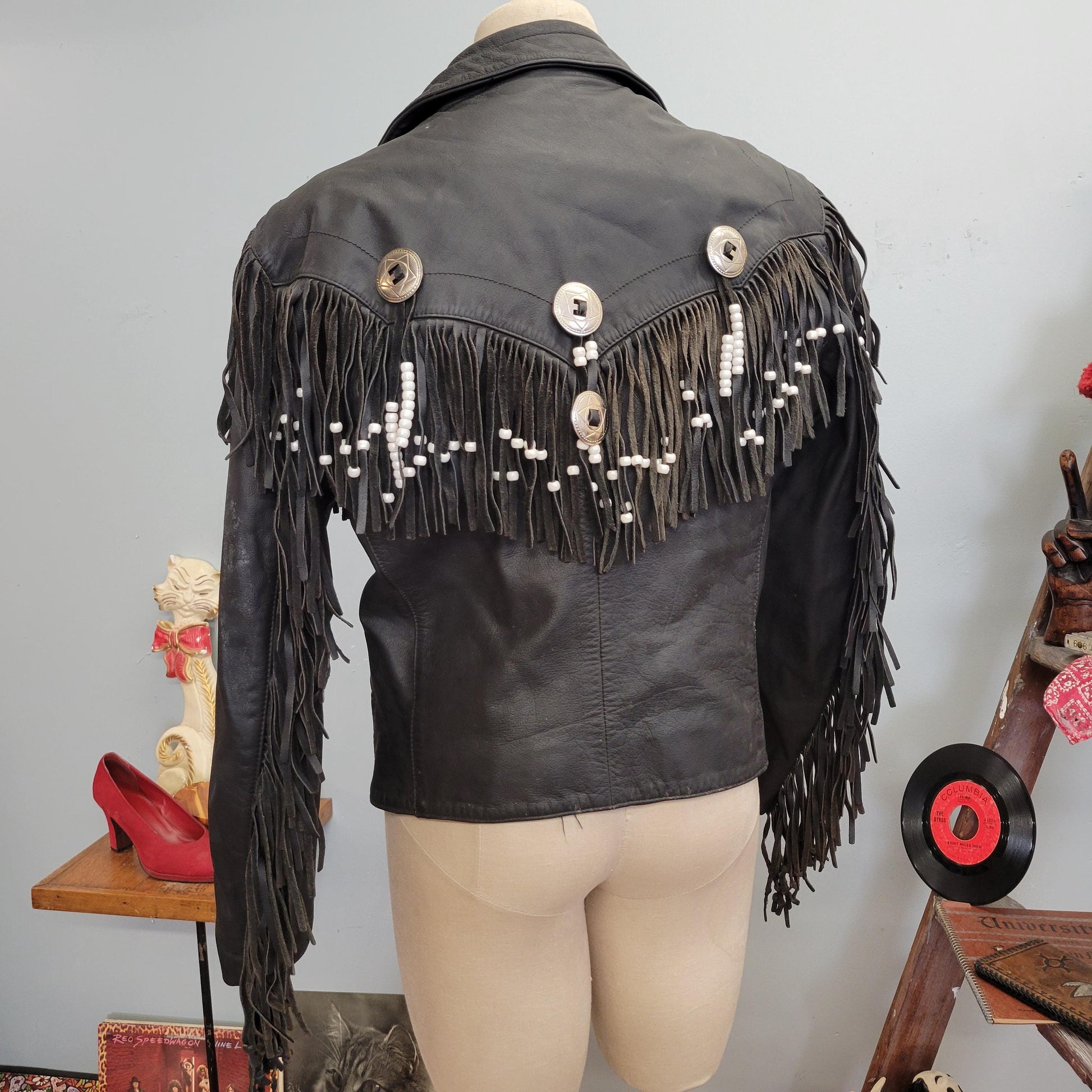 vtg 70s LEATHER FRINGE JACKET // vintage bermans leather experts size 14 metal conch and tassel western biker cowboy style beaded cropped
