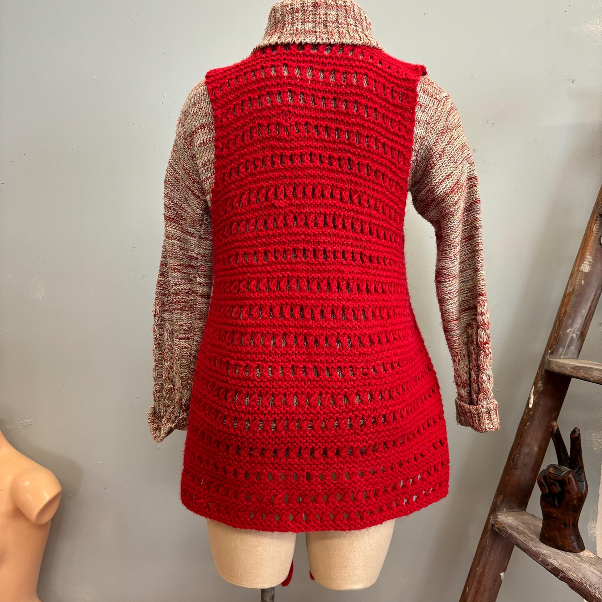 Vintage crochet burgundy/red tie waist long knit layering vest