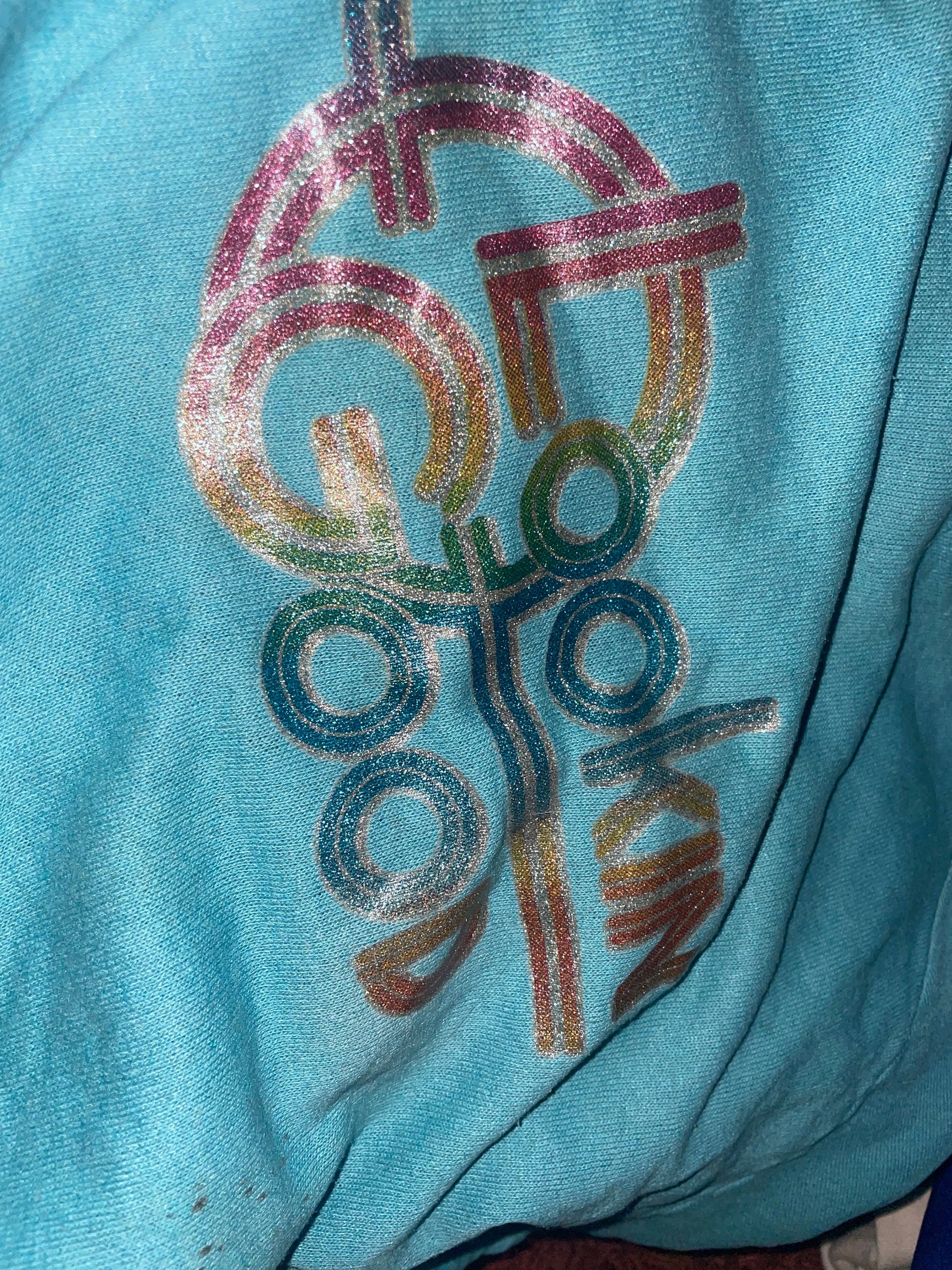 vtg 70s LOOKING GOOD SWEATSHIRT // vintage rainbow retro sparkle Iron on distressed thin blue sticker funny saying ironic pms baggy shirt