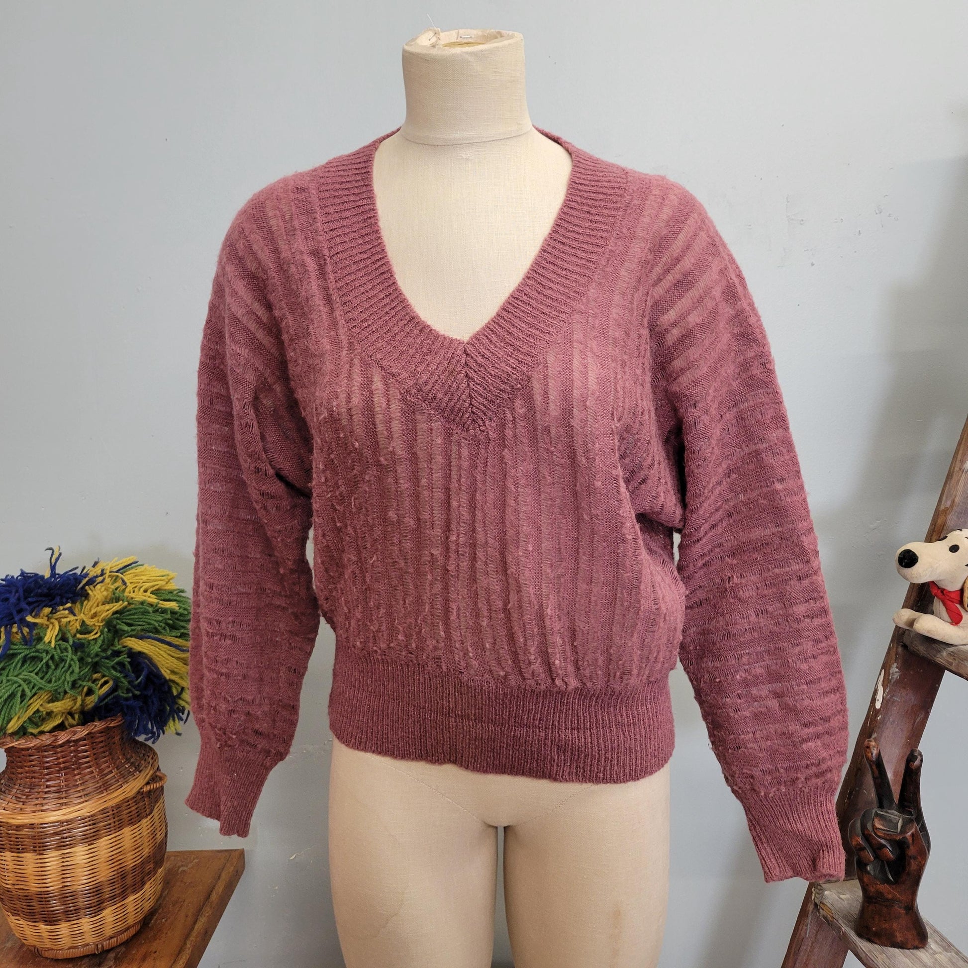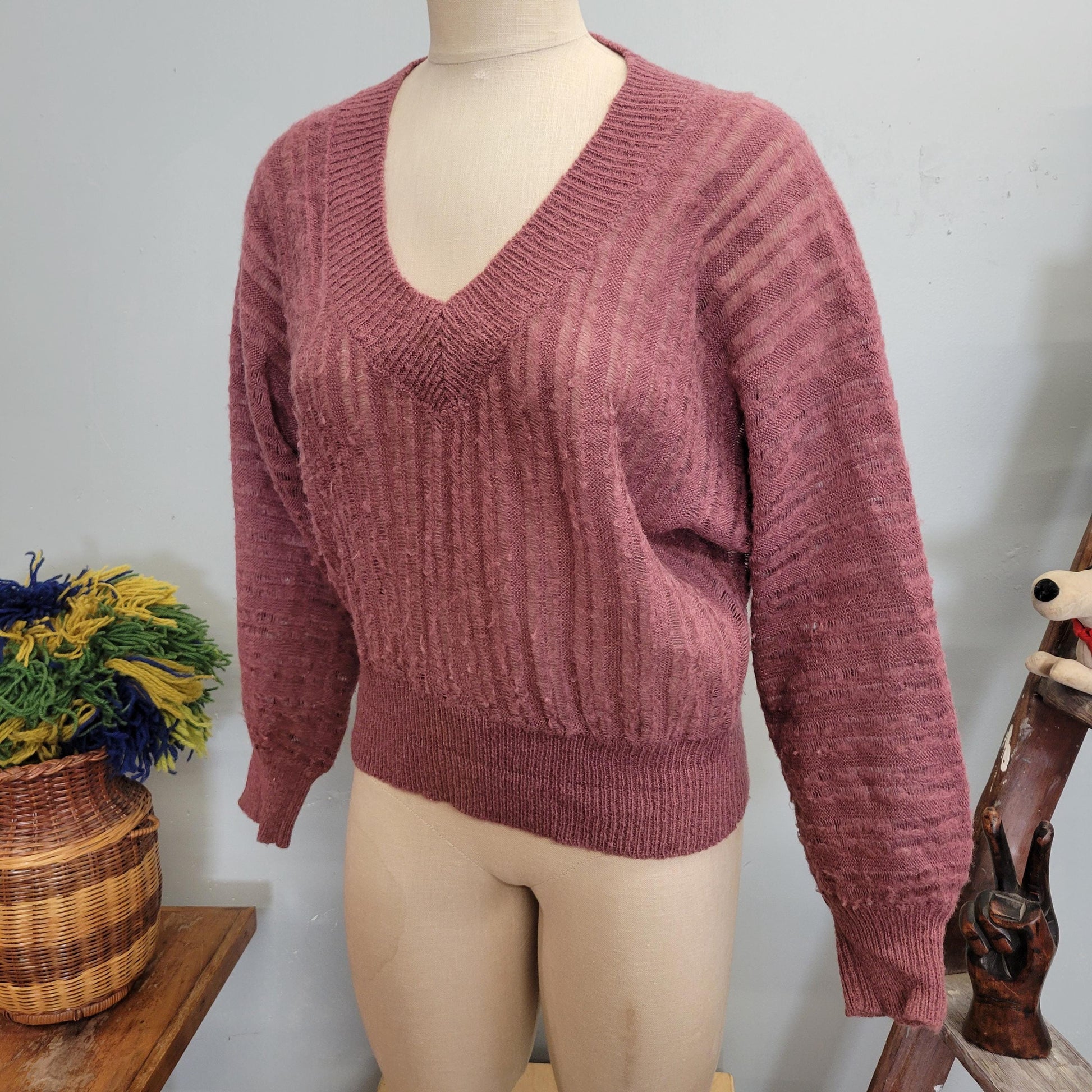 vtg 70s MAUVE KNIT SWEATER // vintage sweater teas medium womens v neck ribbed shaggy lightweight earth tones casual autumn winter style top