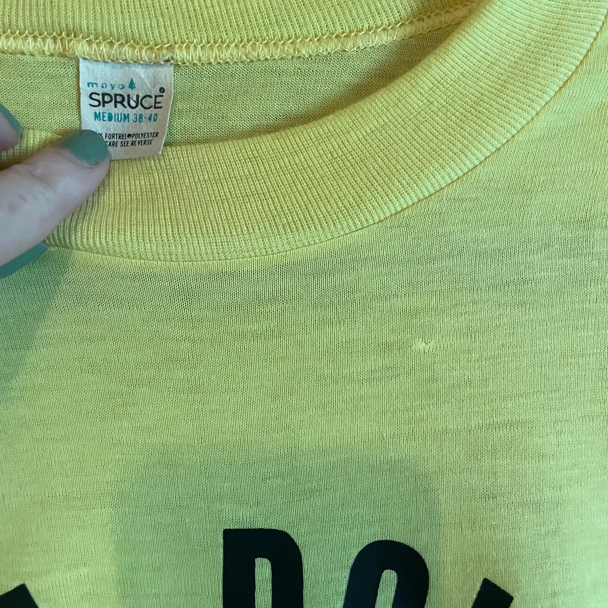 vtg 70s mayo spruce GET DOWN suggestive arrow funny graphic tee James Brown paper thin pale yellow t shirt humorous iron on kickball team