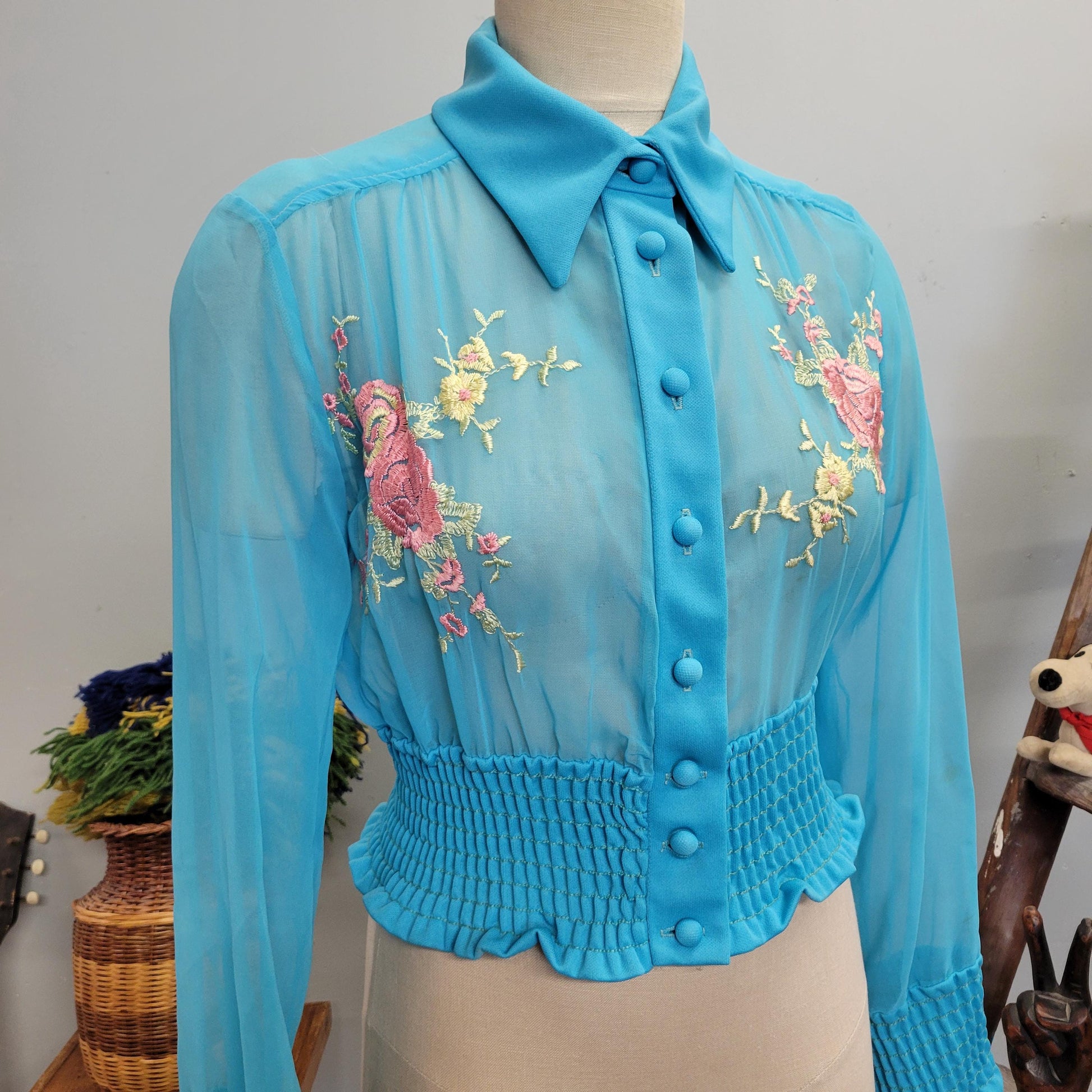 vtg 70s MESH EMBROIDERED TOP // vintage sheer bright blue floral stitch cute pointy collar retro mod hippie kitschy cropped pastel blouse