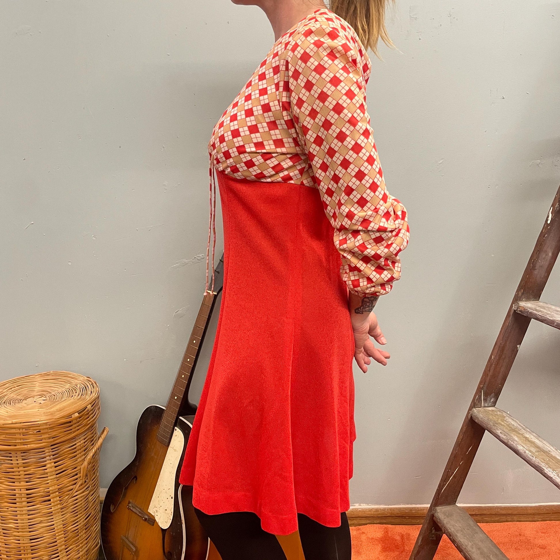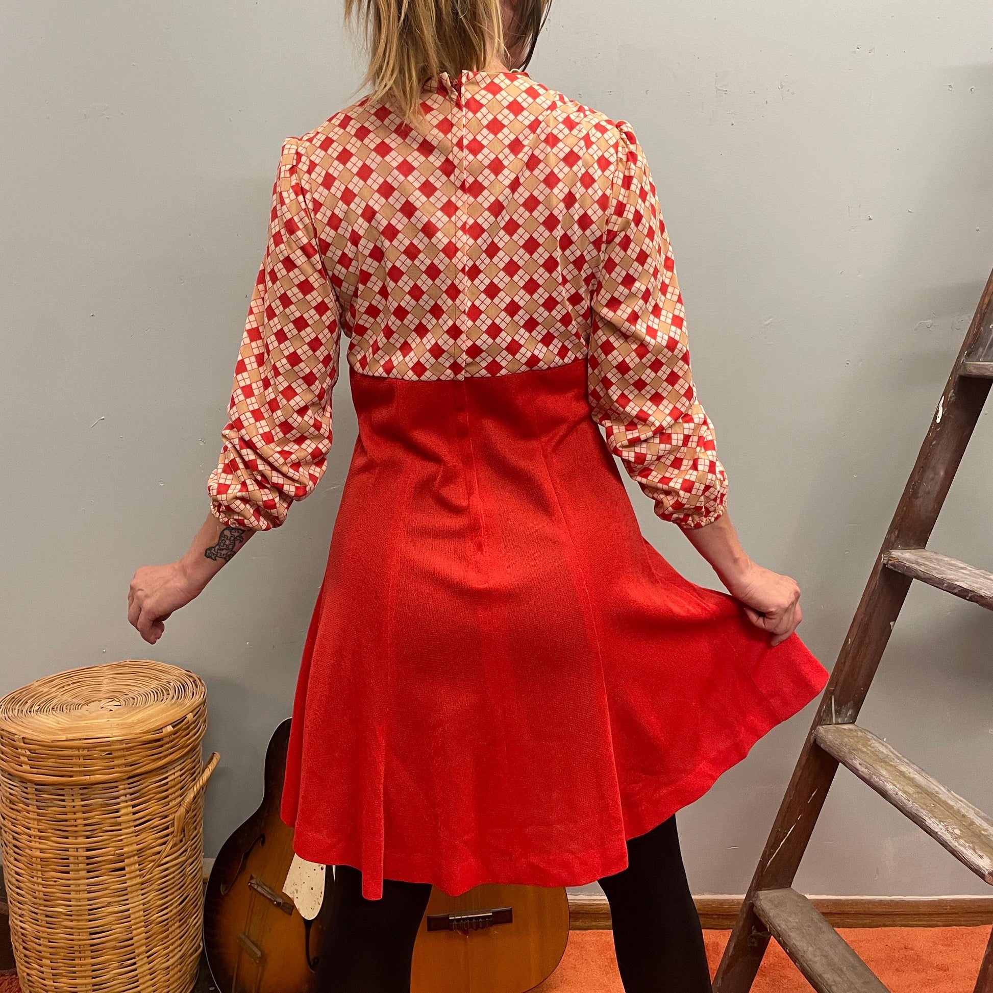 vtg 70s MOD SLINKY MINI Dress // vintage gingham plaid gold & red geometric pattern balloon sleeve retro kitschy autumn fashion 60s cute