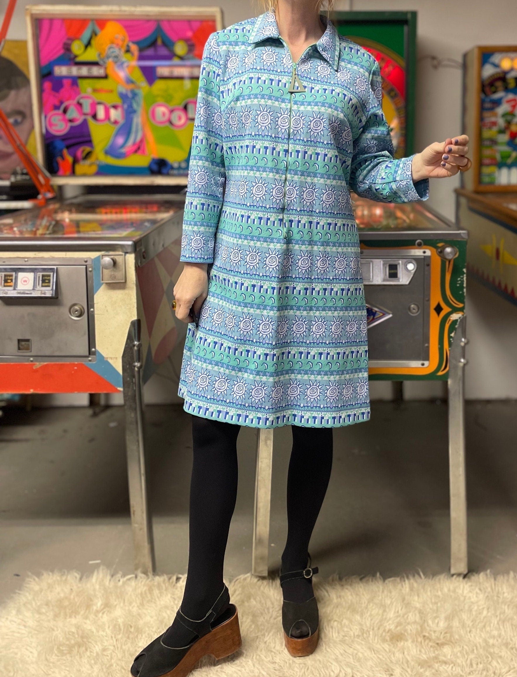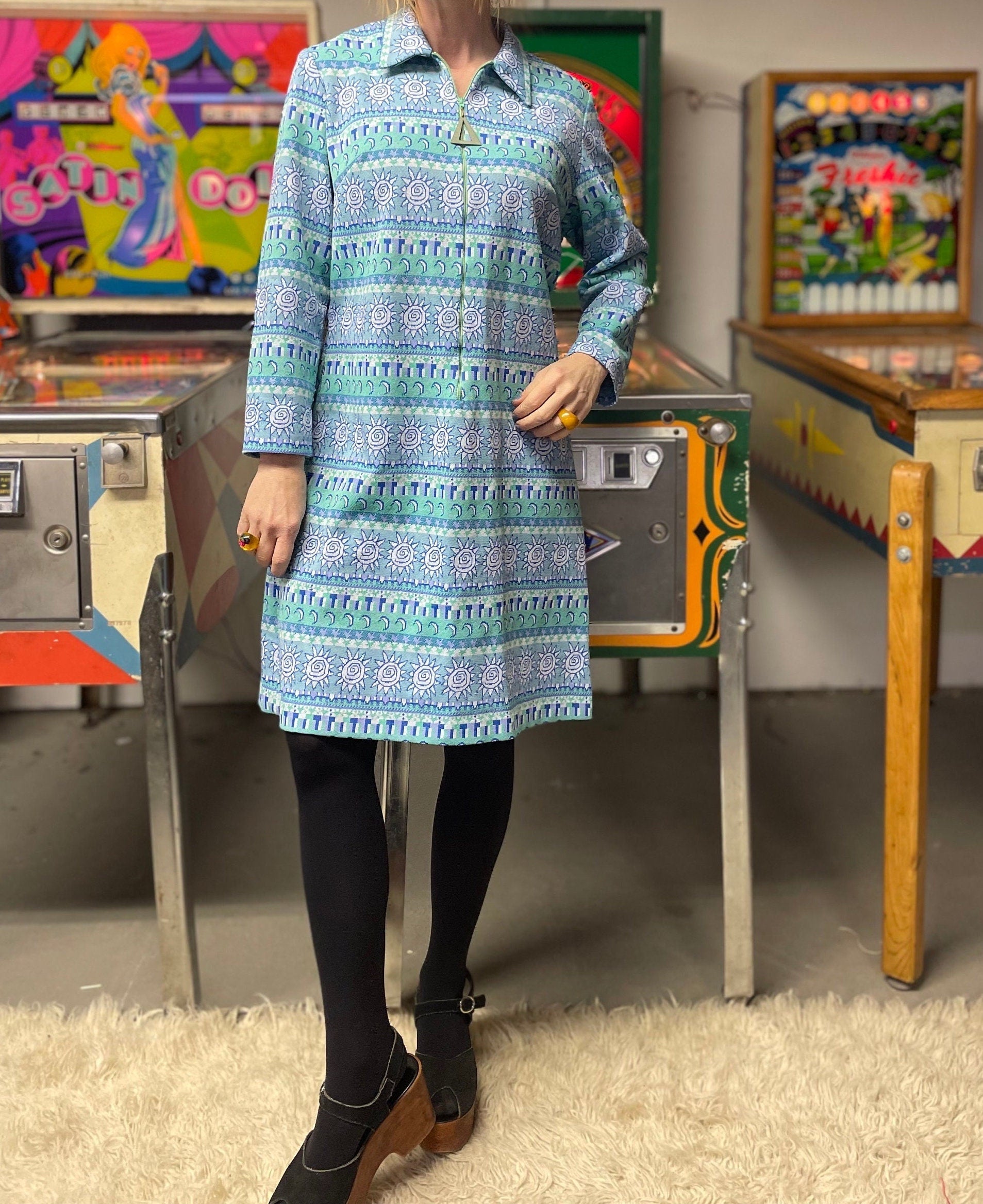 vtg 70s MOON & STARS DRESS // vintage mod celestial pattern tapestry knit sky blue zip white zodiac horoscope all over print novelty print