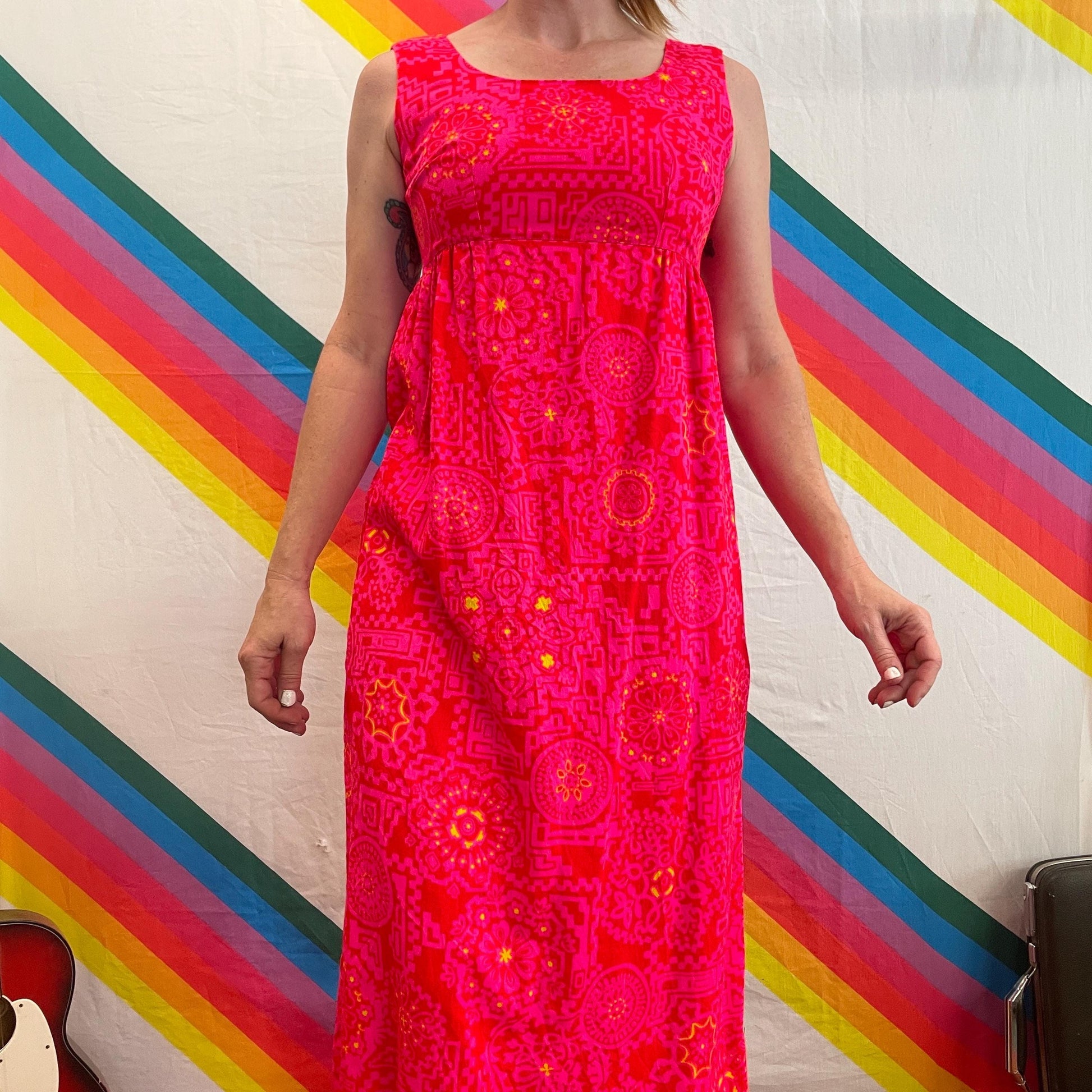 vtg 70s NEON PSYCHEDELIC MAXI // bright neon pink & yellow day glow tank dress hawaiian barkcloth hippie bohemian long flowy gown halloween