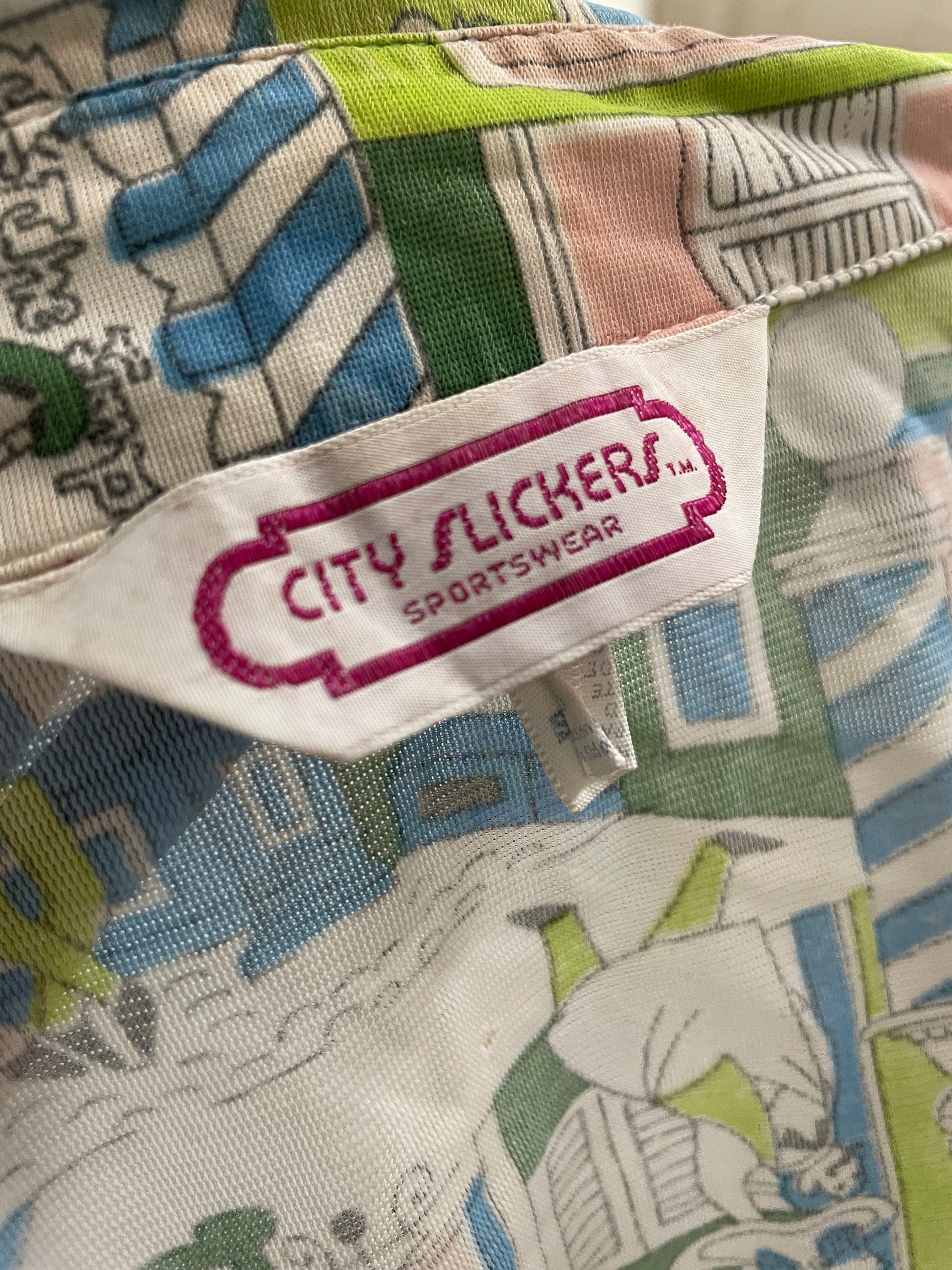 vtg 70s NOVELTY PRINT TOP // vintage womens small 1900s high society scene tie waist pointy collar psychedelic aop hippie cute mod crop top