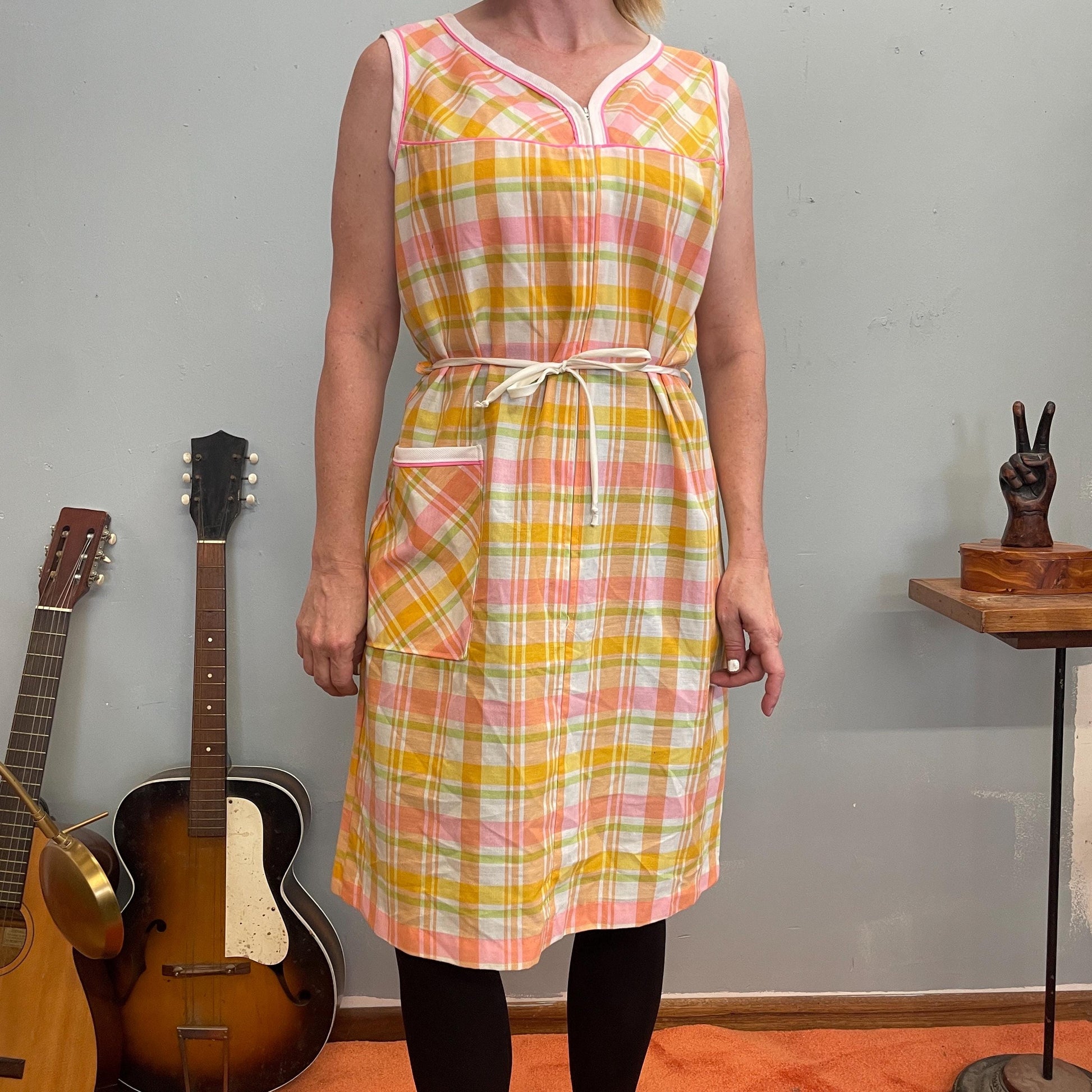vtg 70s PASTEL BELTED DRESS // madras plaid bright neon curvy neckline belted smock day dress with pockets house dress apron cute cover up