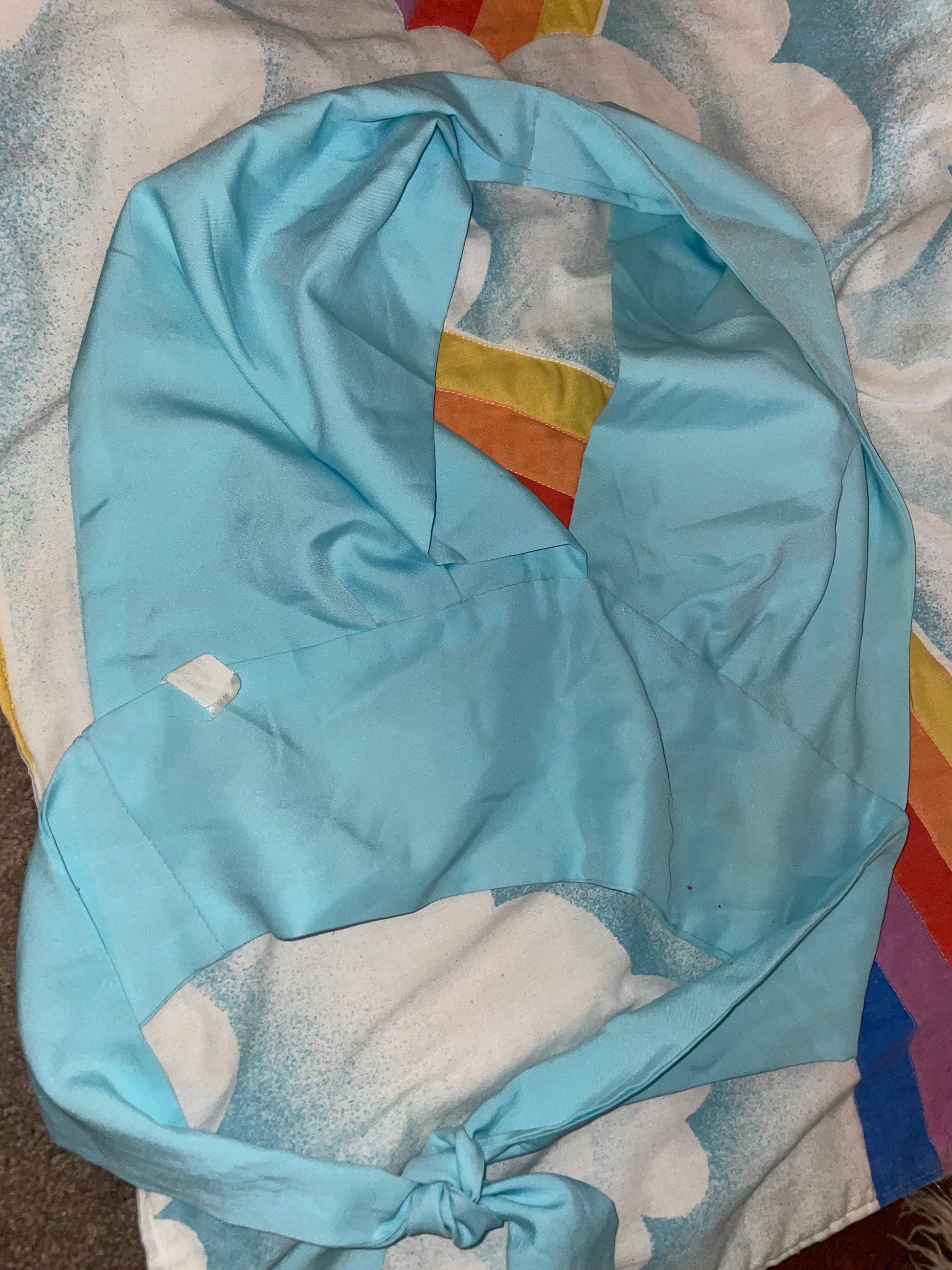 Vtg 70s baby blue halter top v neck tie back retro crop top summer midriff shirt