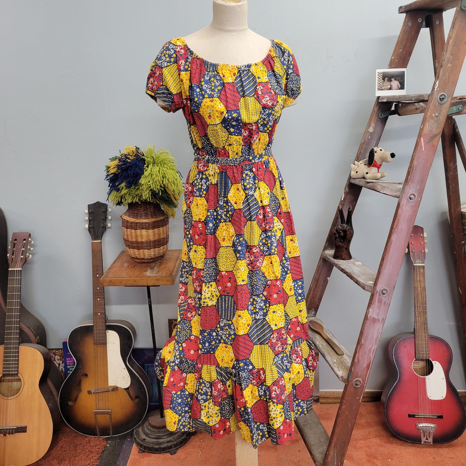 vtg 70s PATCHWORK COTTAGE DRESS // vintage belted womens large scoop neck hippie americana boho folk art puffed sleeve maxi bandana pattern