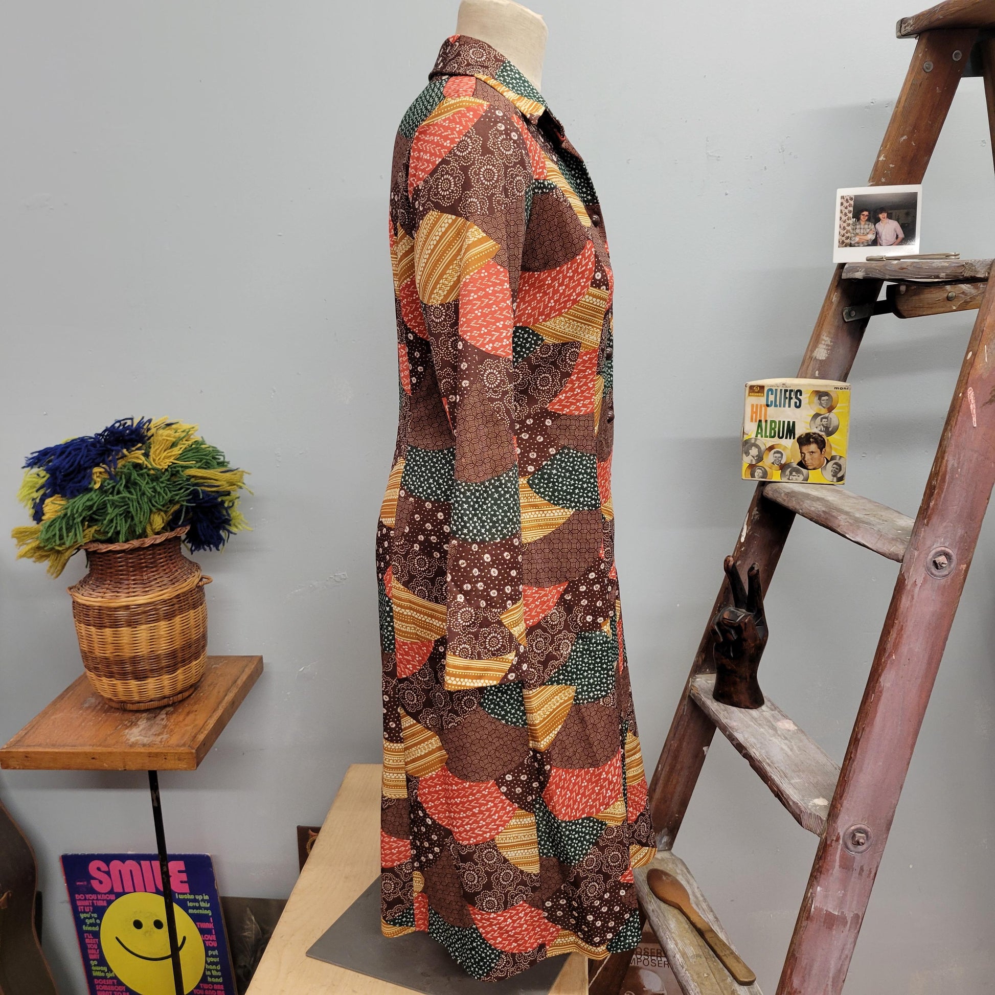 vtg 70s PATCHWORK DRESS // vintage autumn fall fashion sears womens medium floral bandana abstract patterned collared mod hippie brady bunch
