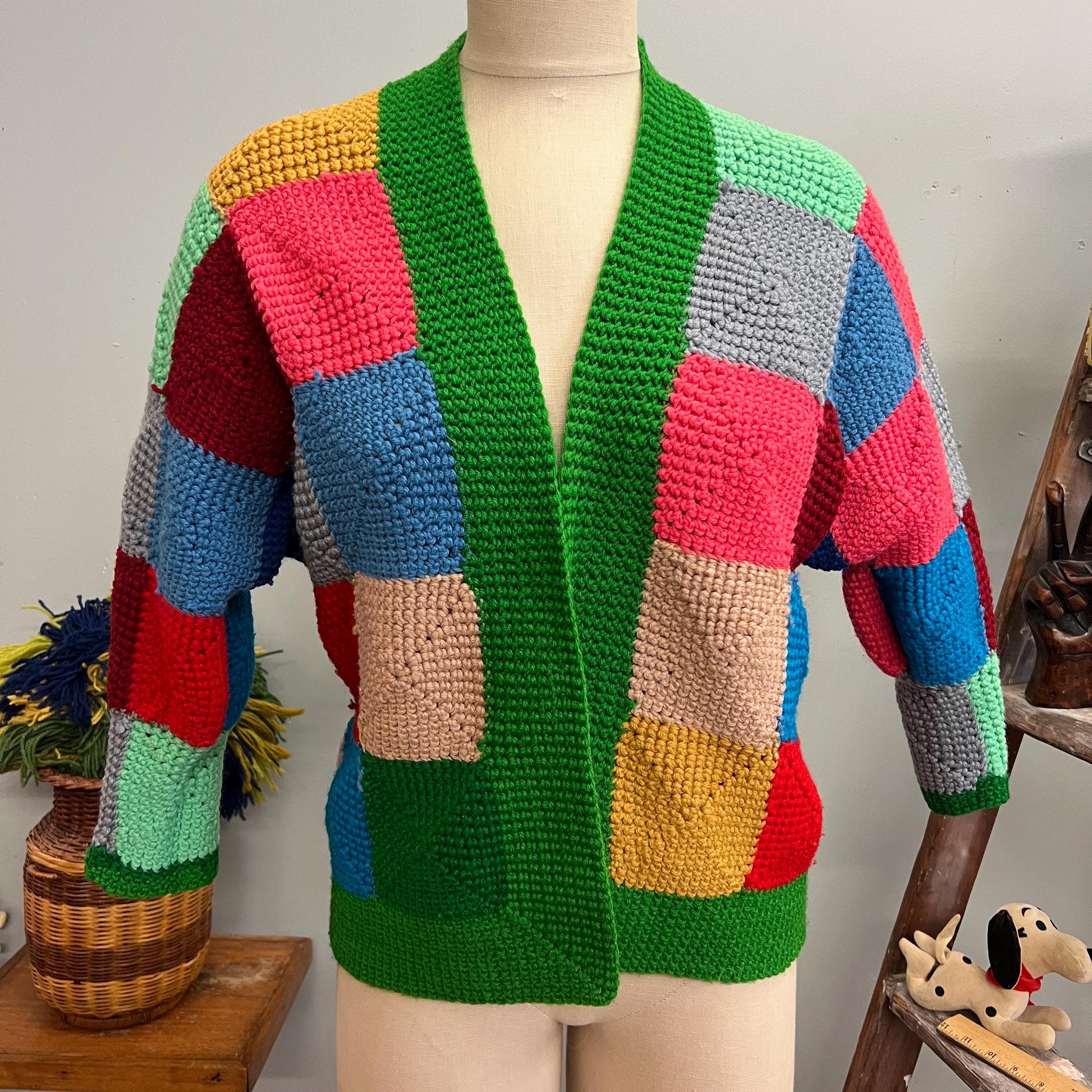 vtg 70s PATCHWORK RAINBOW CARDIGAN // vintage knit geometric pastel granny squares afghan sweater mod hippie retro autumn winter fashion top