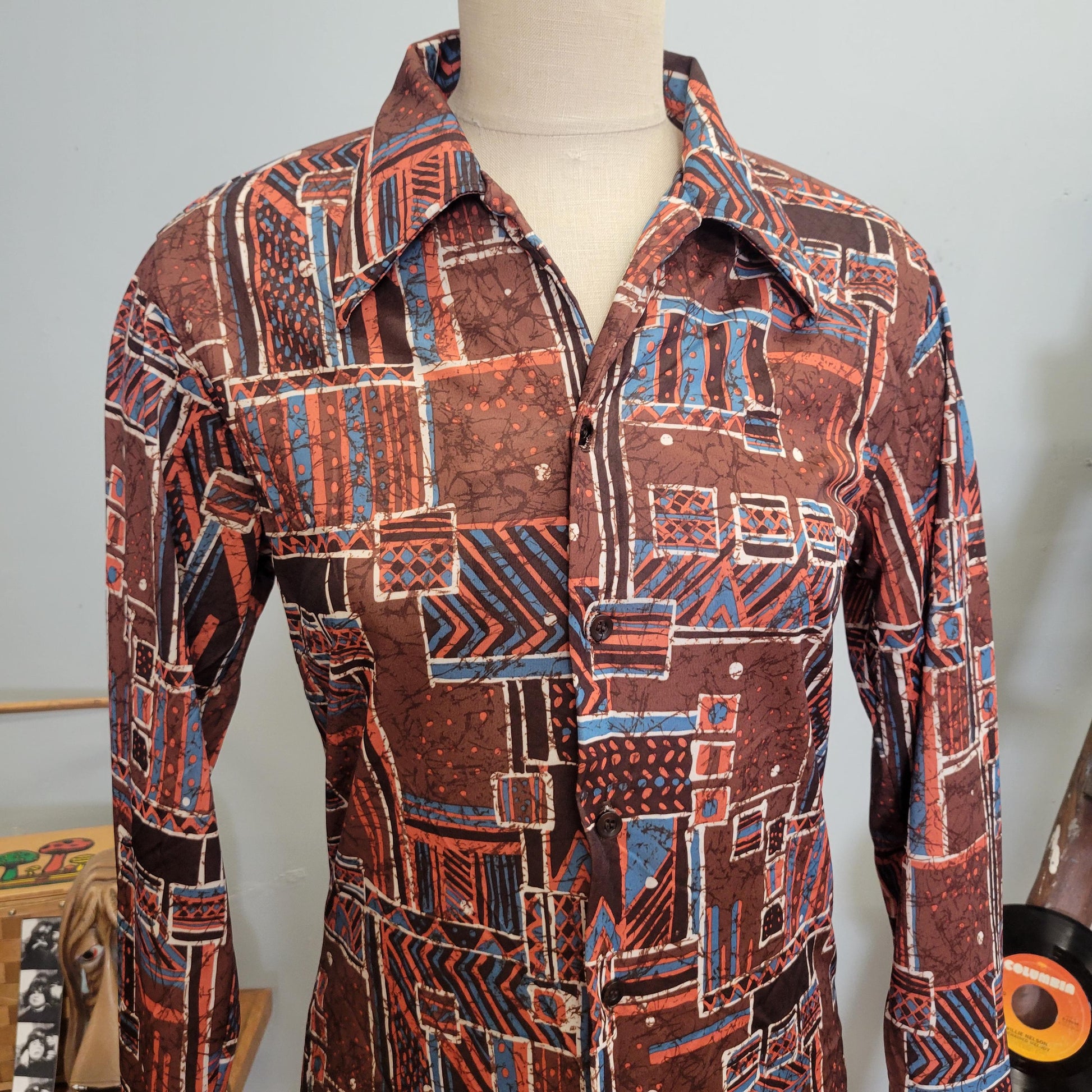 vtg 70s PATTERNED SILKY BLOUSE // vintage button down kmart medium mens abstract psychedelic pointy collar retro hippie disco mod autumn top