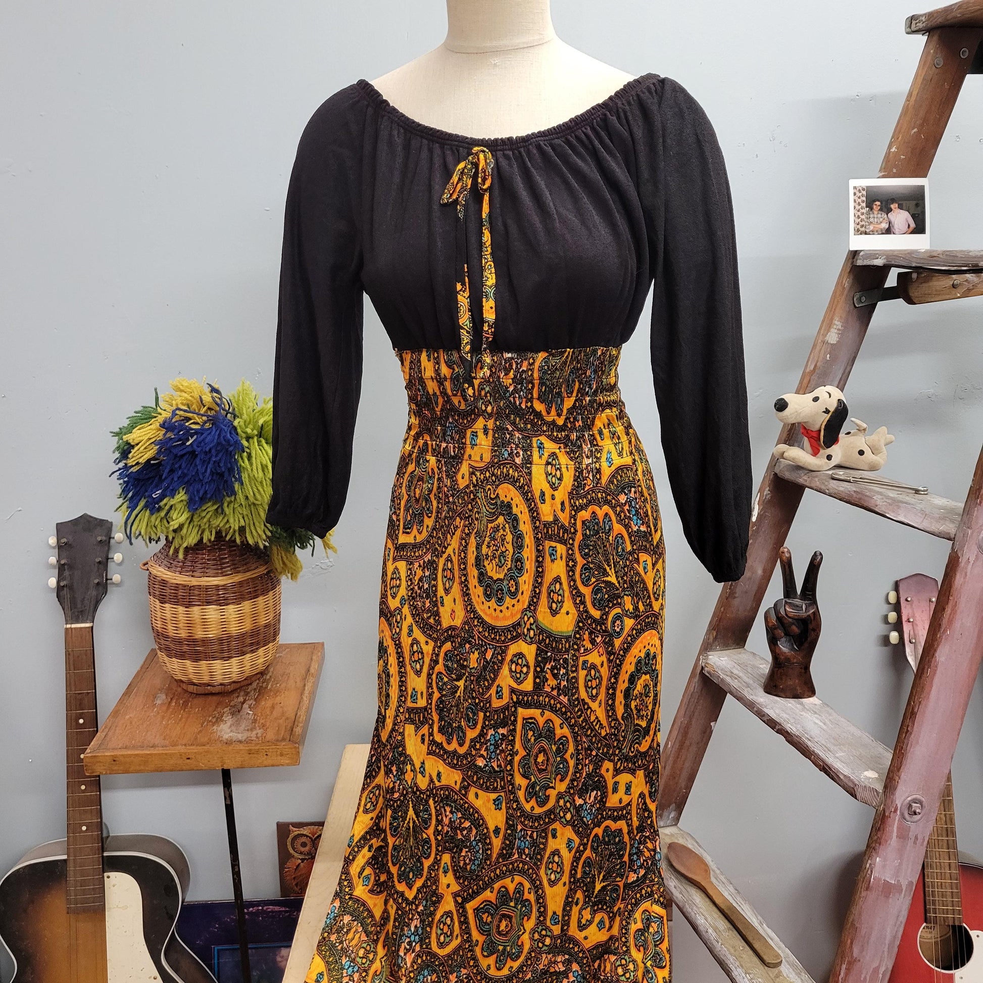 vtg 70s PSYCEHDELIC PATTERN DRESS // vintage womens small paisley patterned silky scoop neck autumn vibes gown retro hippie mod maxi dress