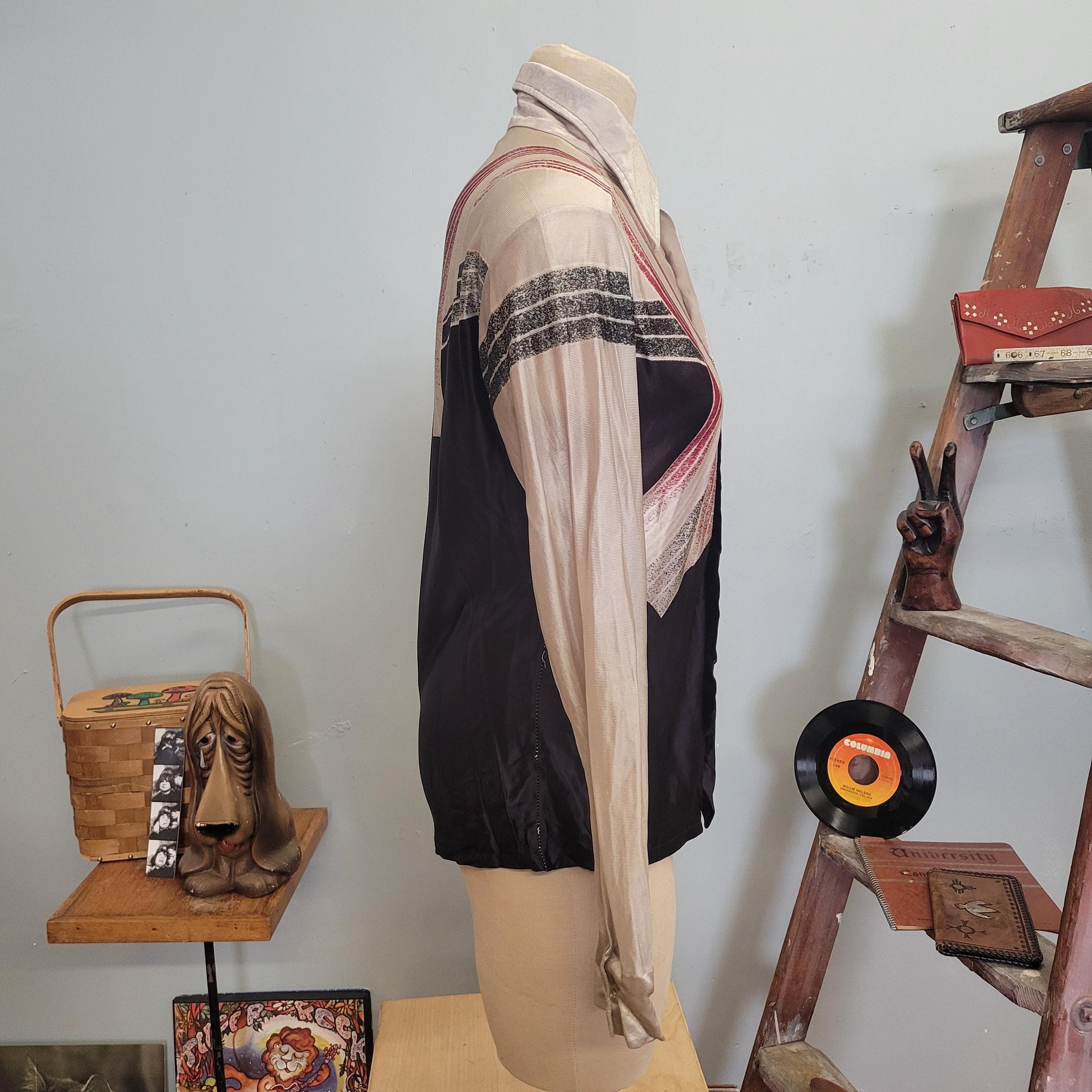 vtg 70s PSYCHEDELIC ART DECO Top / vintage button down blouse western maxino medium retro nylon op art disco hippie mod style autumn fashion