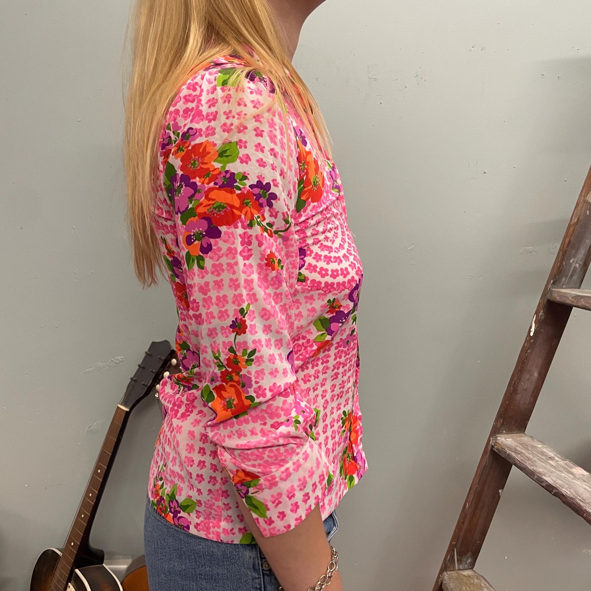 vtg 70s PSYCHEDELIC COLLARED BLOUSE // vintage pink floral button up pointy collared light weight polyester patterned top hippie mod retro