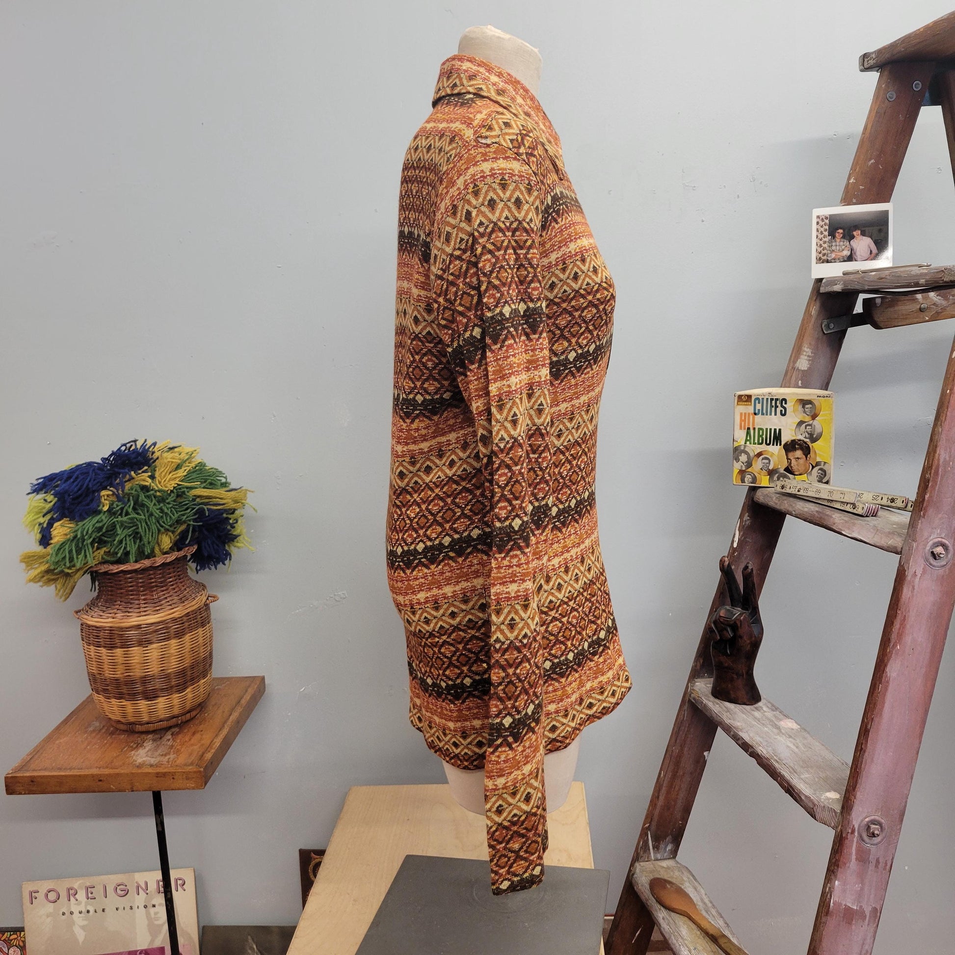 vtg 70s PSYCHEDELIC RETRO SWEATER Top // vintage jantzen medium womens pointy collar zip up neutral earth tones autumn vibes sweater mini