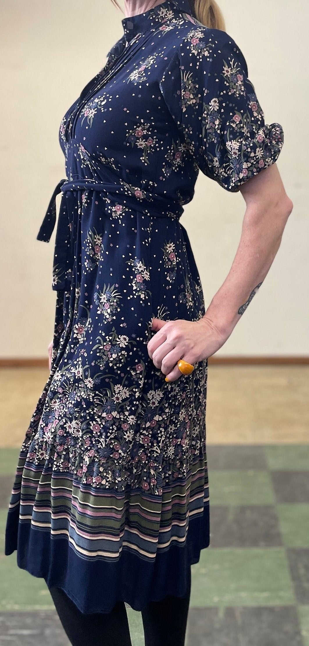 Vintage 70s Does 30s Floral Print Dress / Puffed Sleeve Belted Flowy Dress With Pockets / Pintuck Dress