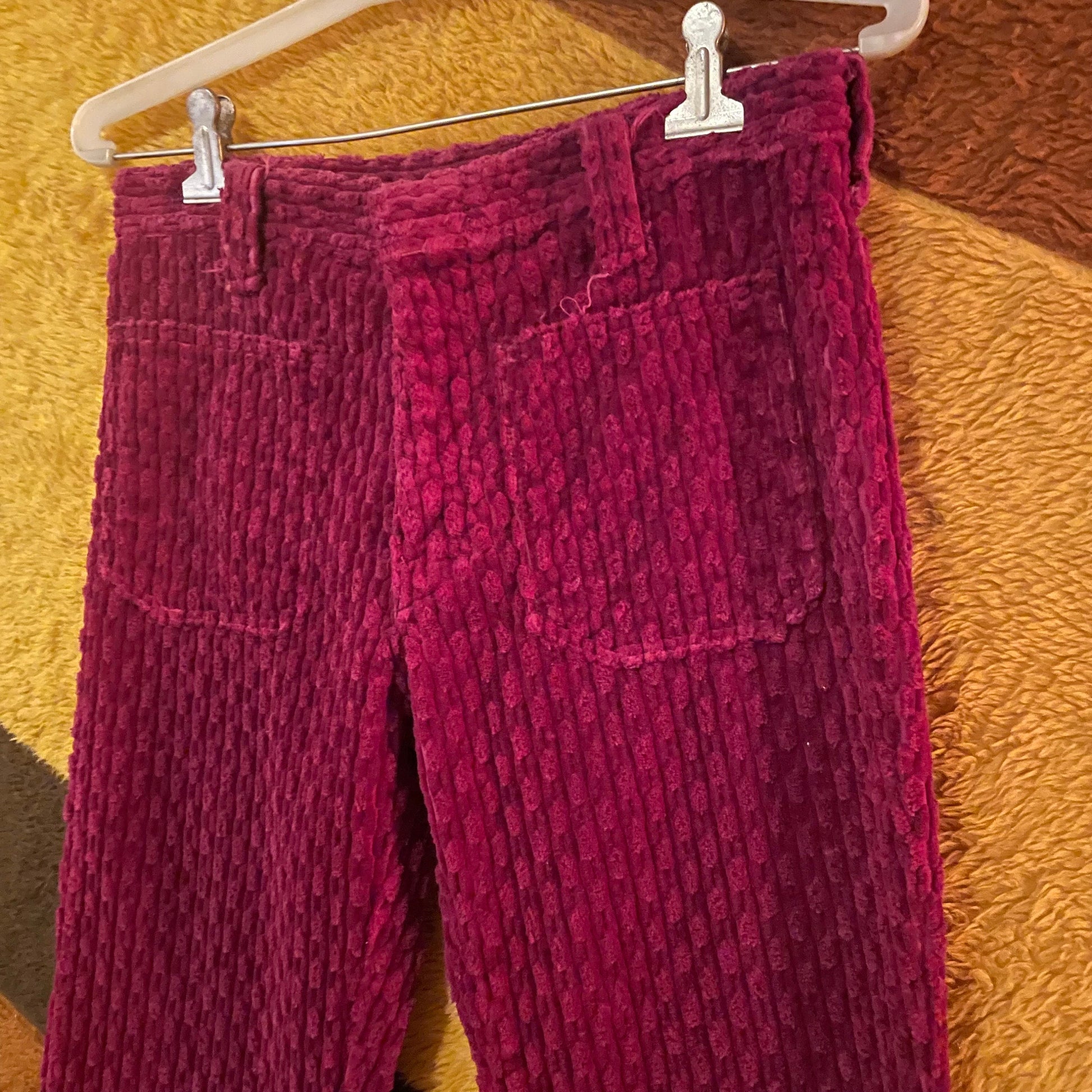 Vtg 70s rocker purple chenille pants front pocket flares ribbed textured hip huggers retro hippie mod mid rise velvet Hendrix stylist iconic