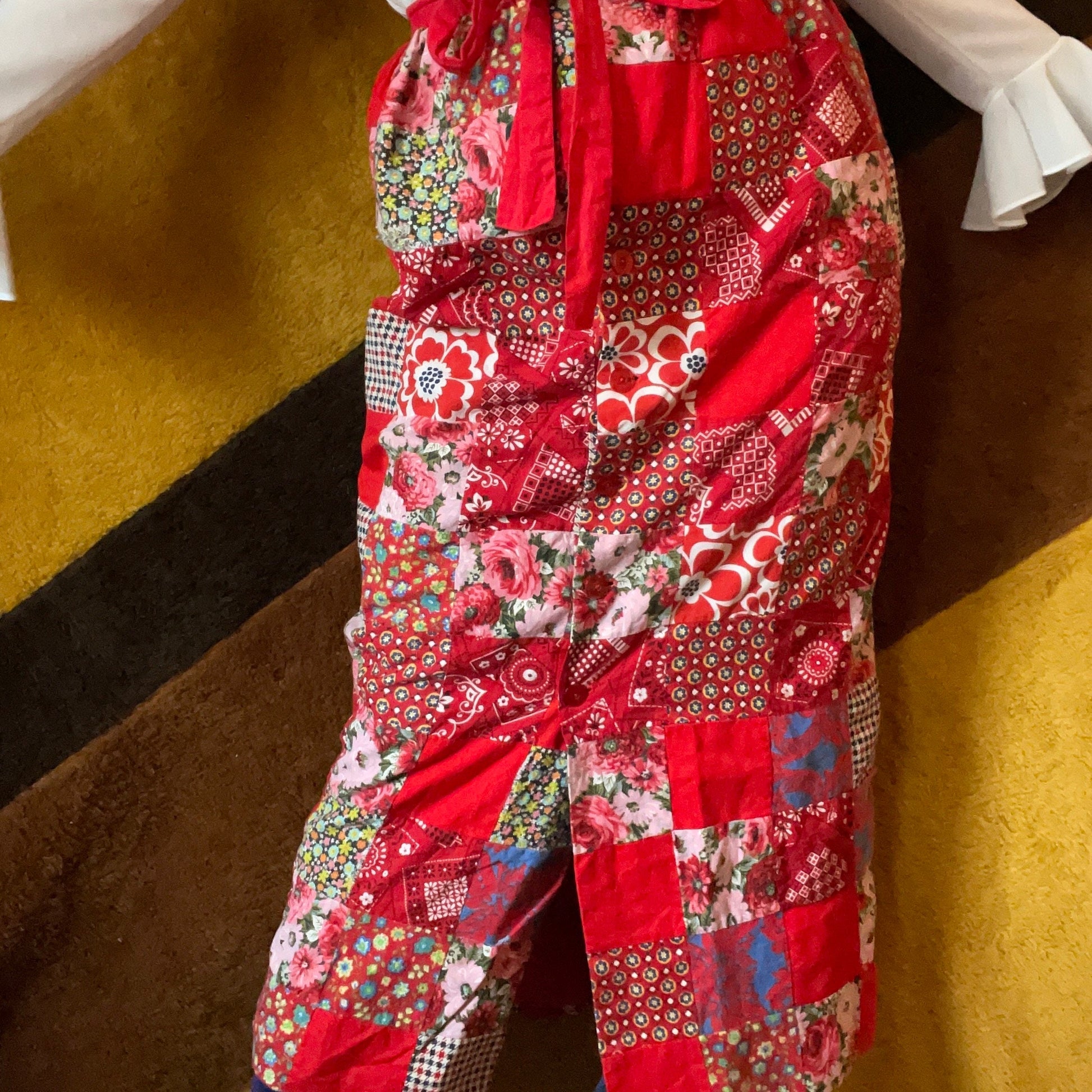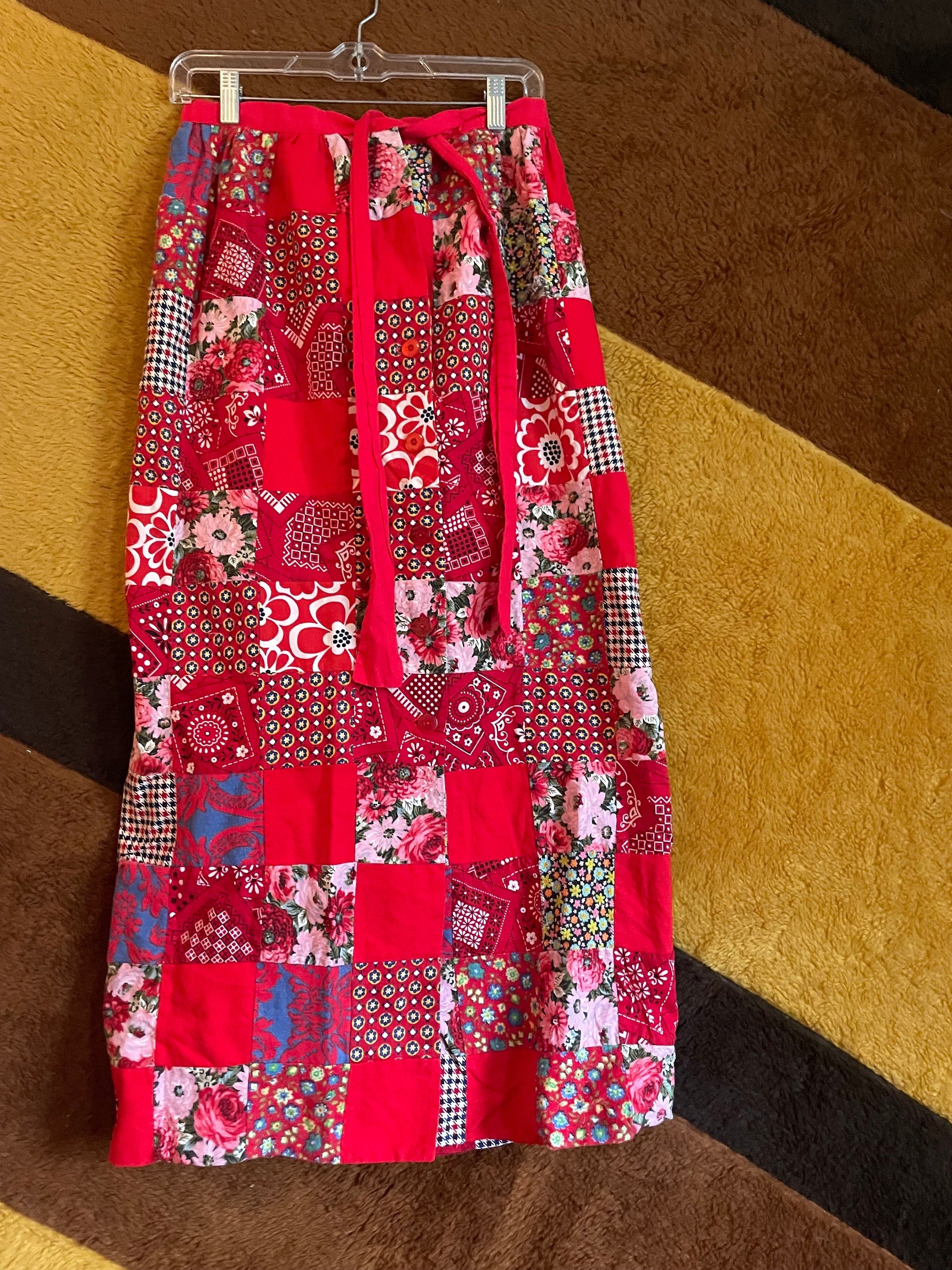 vtg 70s red roses patchwork skirt floral square patches belted full length romantic hippie boho maxi skirt cottage core kitschy twee