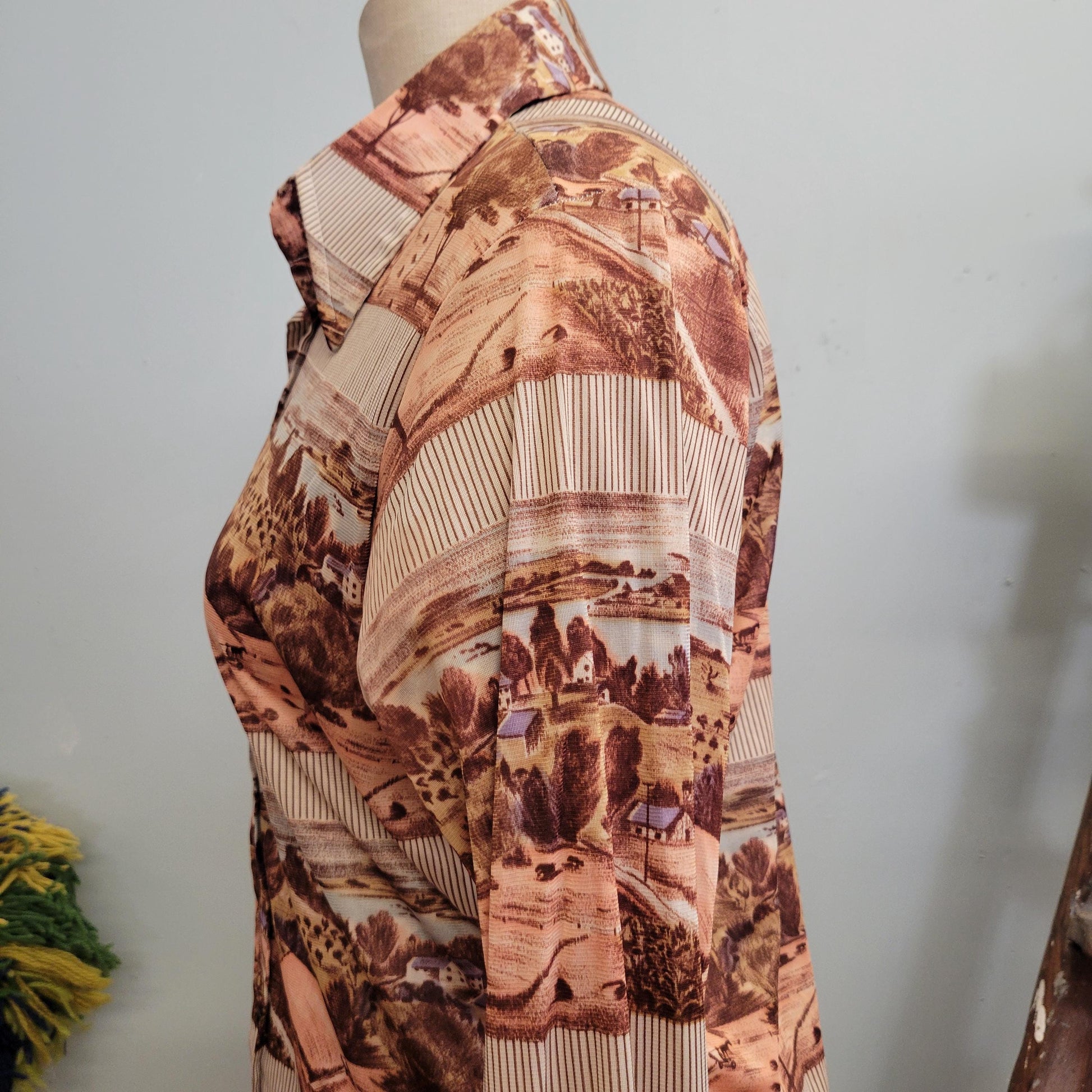 vtg 70s SILKY FARM TOP / vintage button down monzini knit large nylon retro western theme fall disco hippie pointy collared all over print
