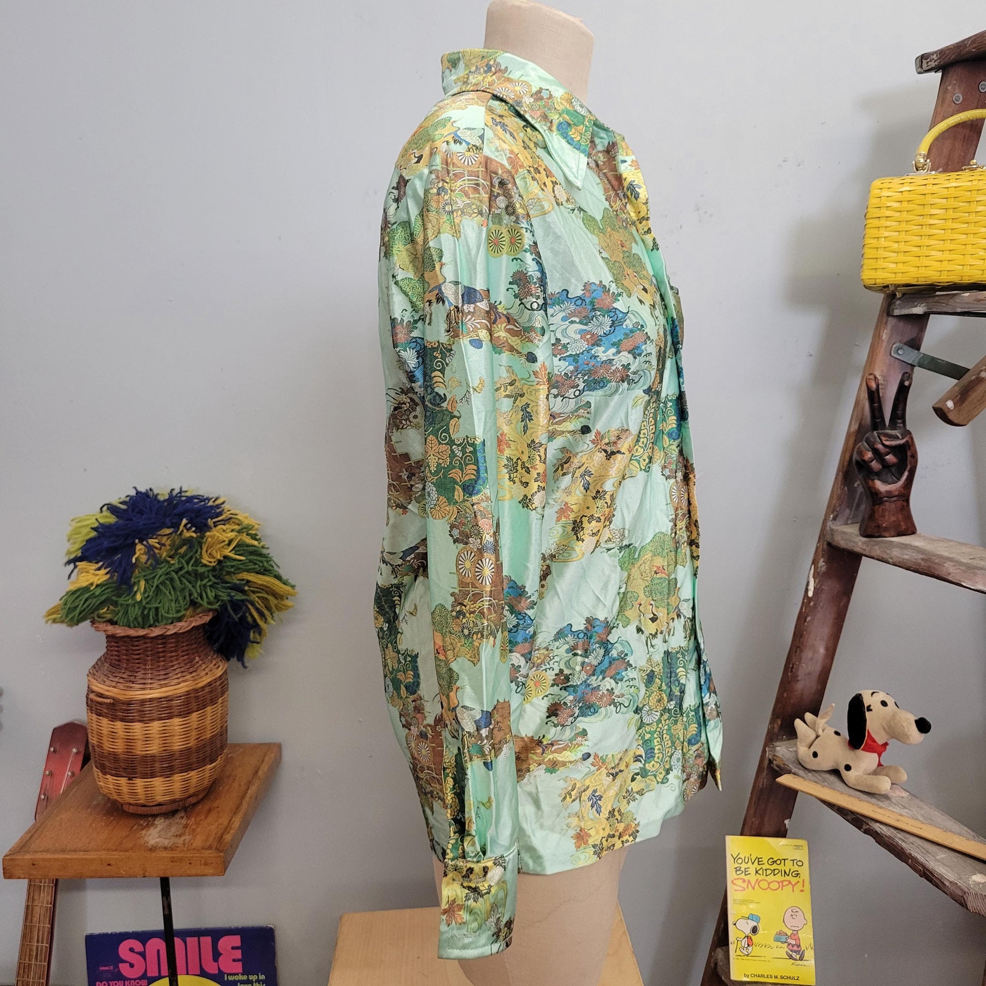 vtg 70s SILKY PATTERN TOP // vintage waltch clarkes psychedelic Asian bird peacock print disco retro polyester patterned blouse autumn top