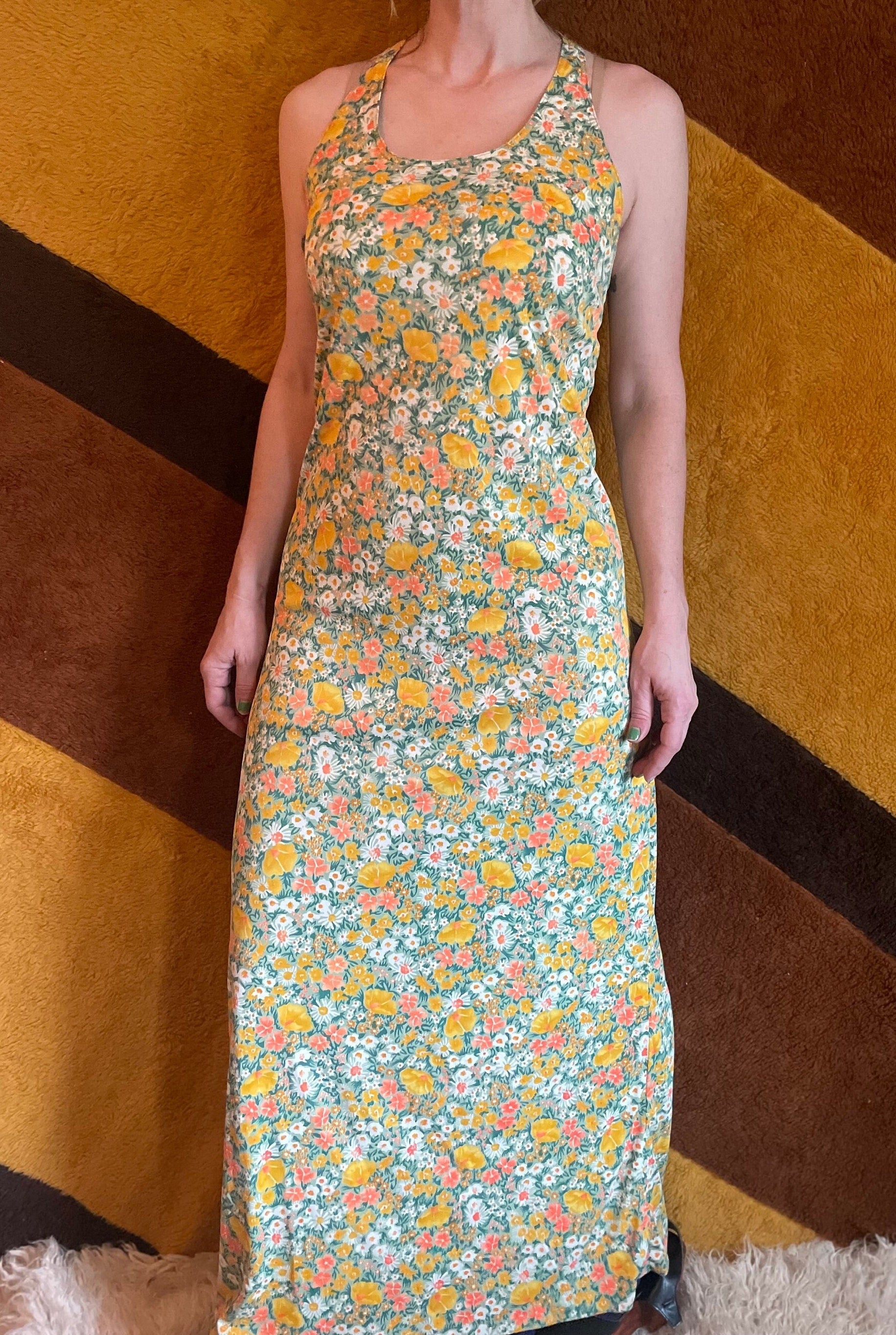 vtg 70s orange & green floral maxi tank dress ~ flowy garden day dress ~ breezy lightweight summer day to night dress