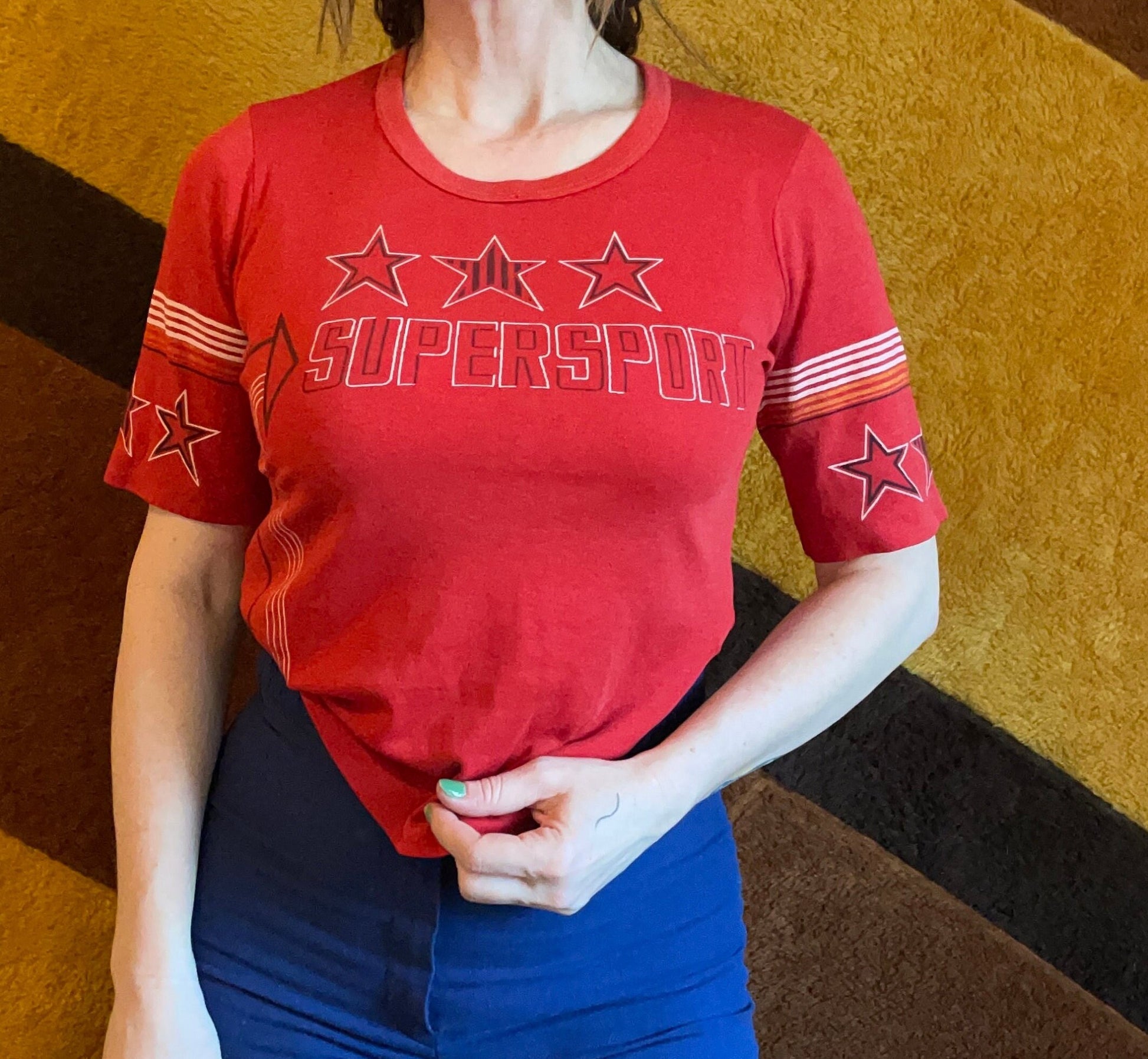 70s Super Sport star patterned paper thin pop art striped 3/4 sleeve retro graphic tee muscle car shirt red arrows stars race car top