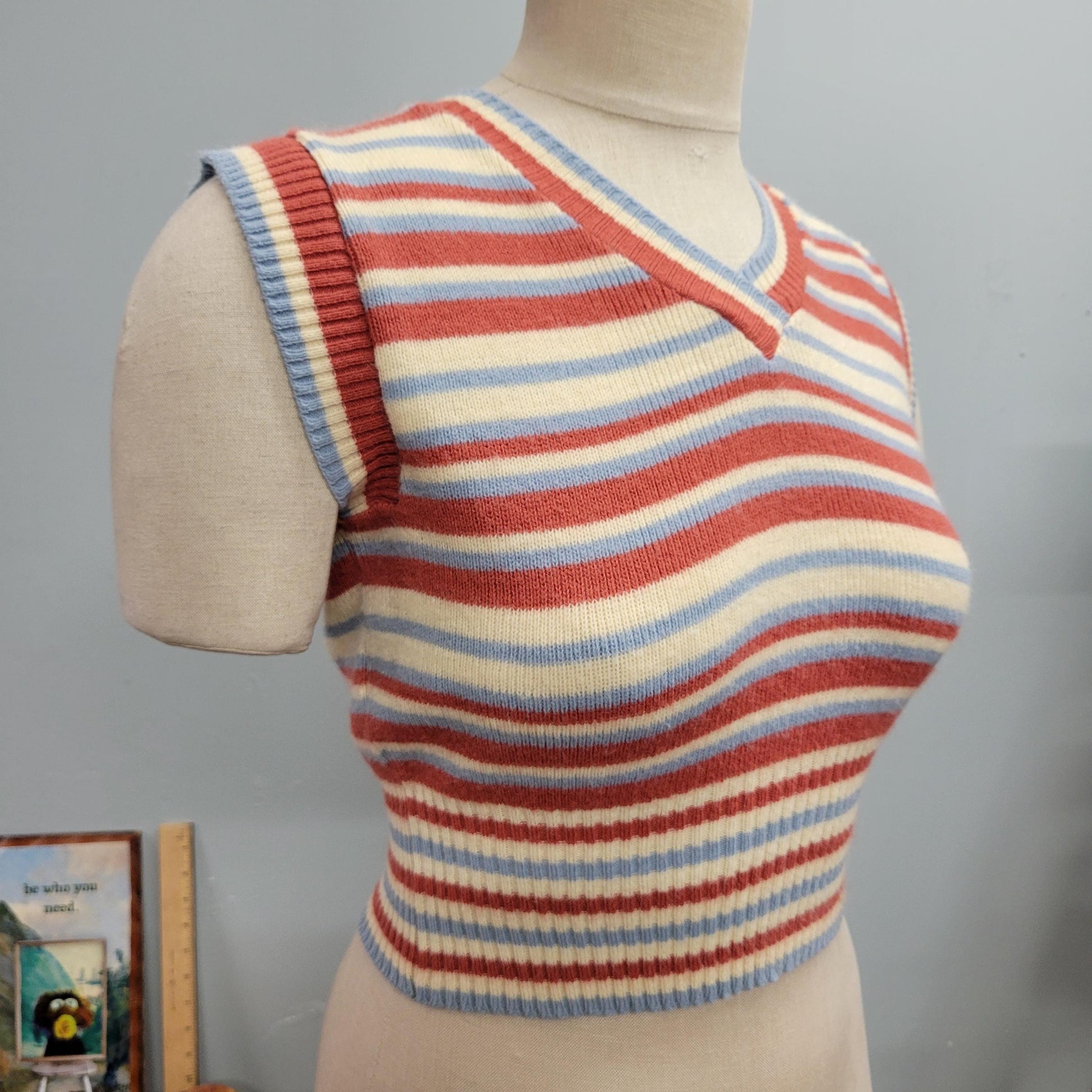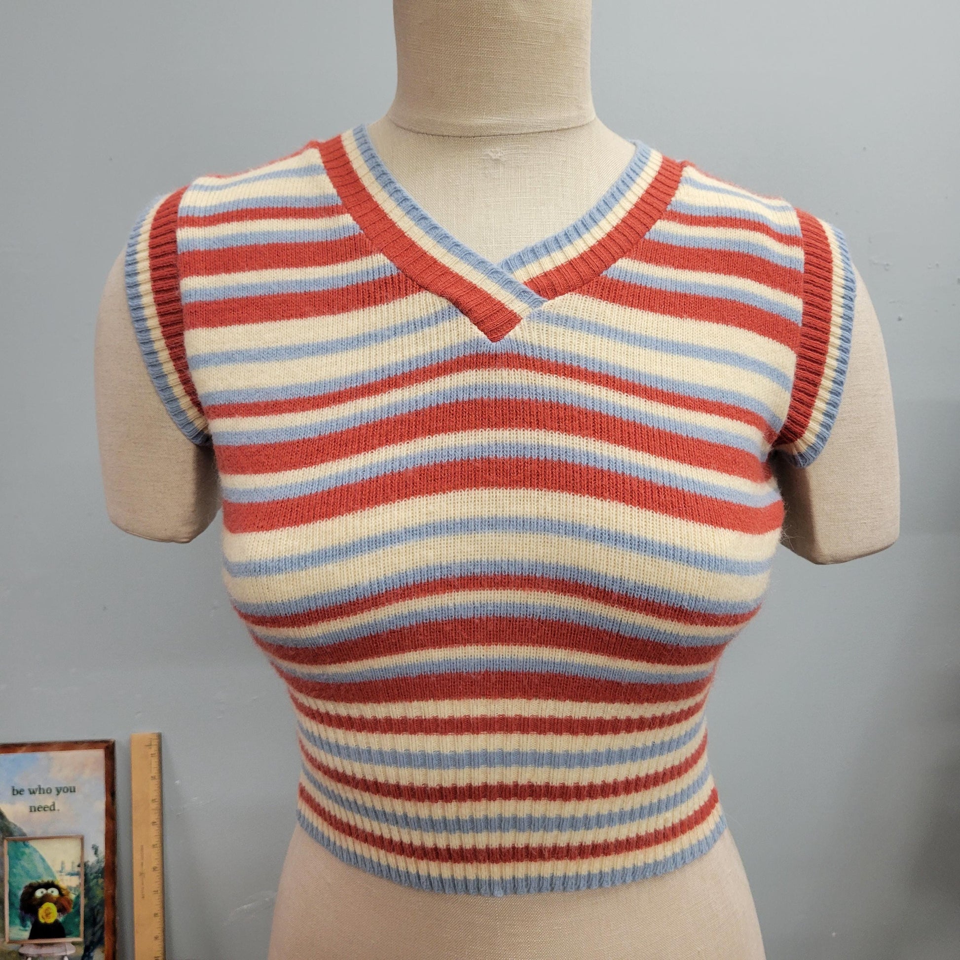 vtg 70s STRIPED SWEATER TOP / vintage crochet knit tank crop top cute small layering piece striped retro v neck cropped autumn sweater layer