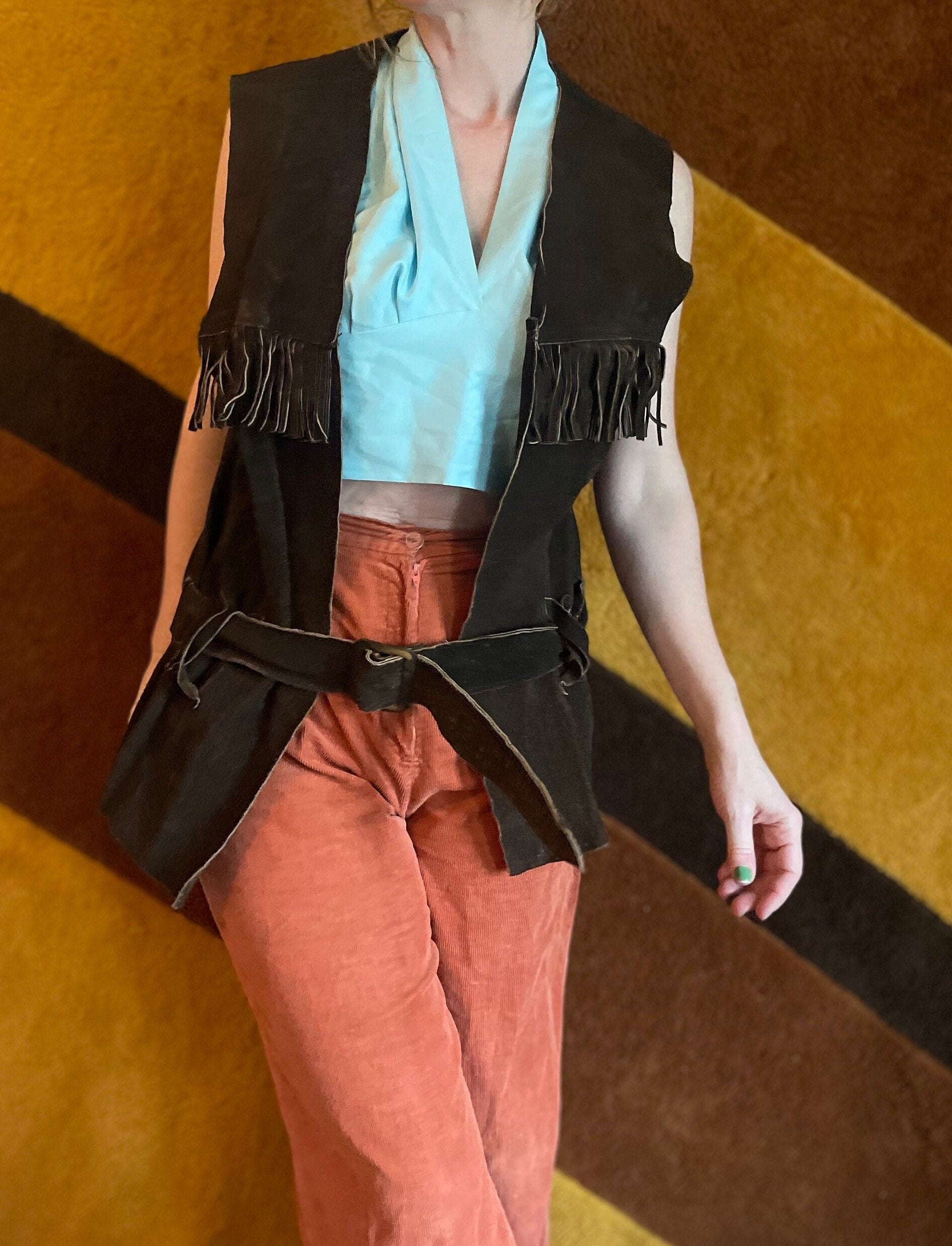 Vintage 70s dark chocolate brown suede fringe vest waistcoat with belt hippie western boho davy crockett acid retro festival
