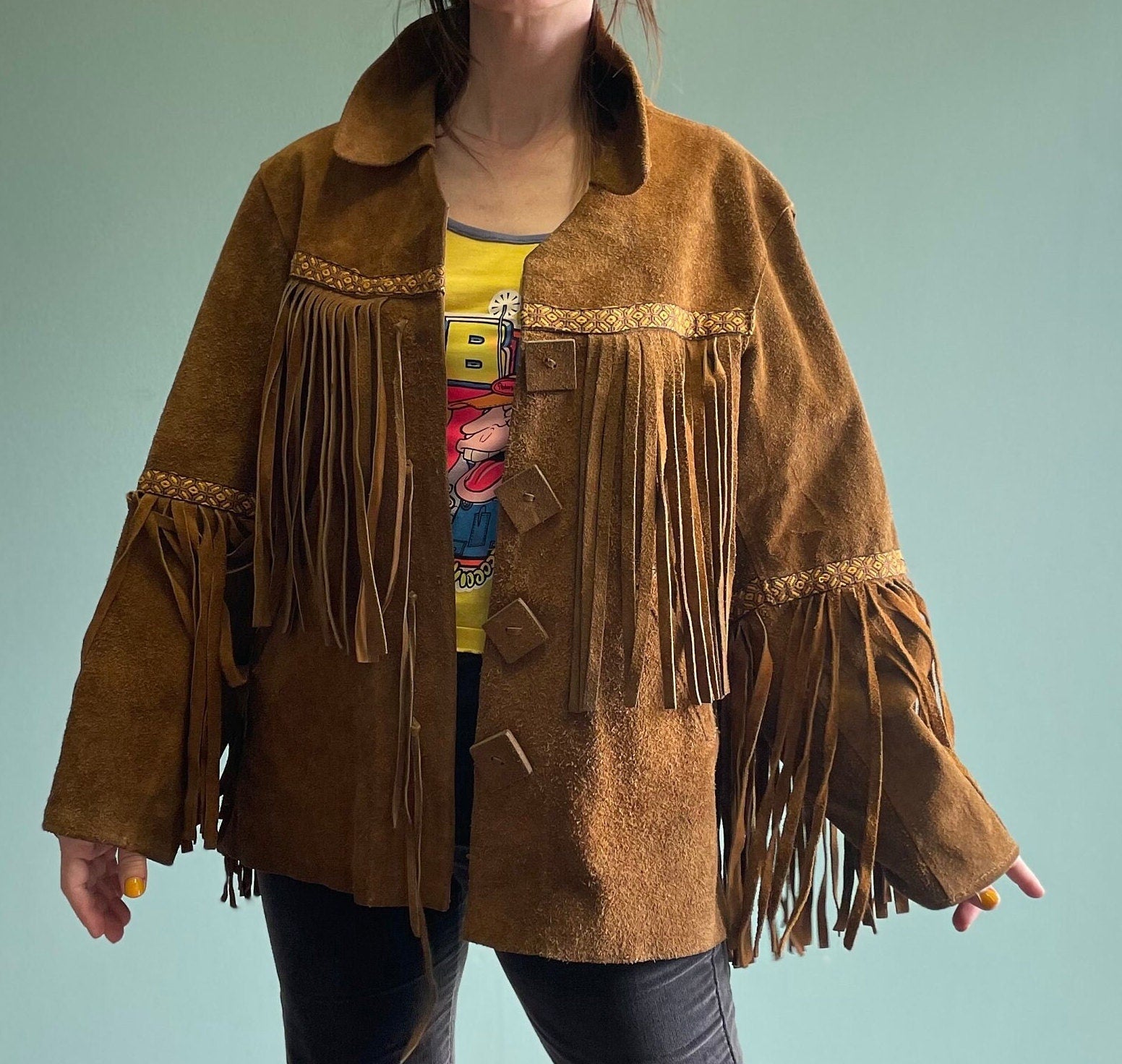 vtg 70s SUEDE FRINGE JACKET // vintage tapestry embroidered brown leather fringe hippie western boho davy crockett buckskin easy rider biker