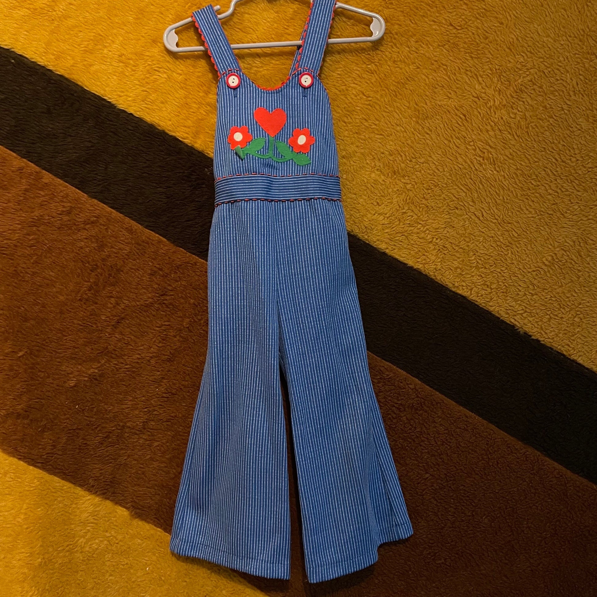 BEST! vtg 70s toddler overalls heart flowers applique hippie boho bell bottom overalls girls retro pinstriped coveralls summer girls clothing cute kitschy cute hippie girl clothes